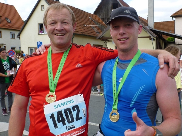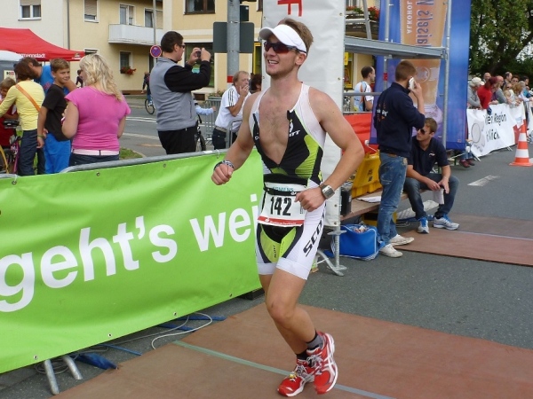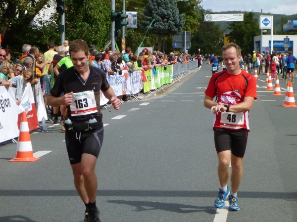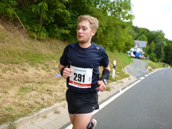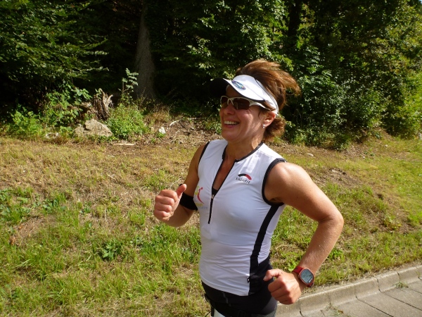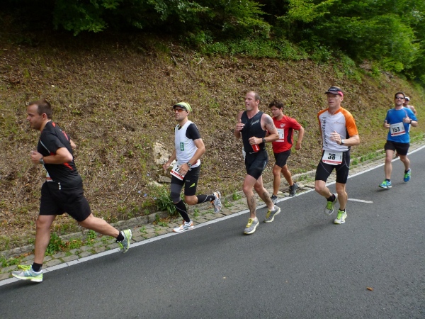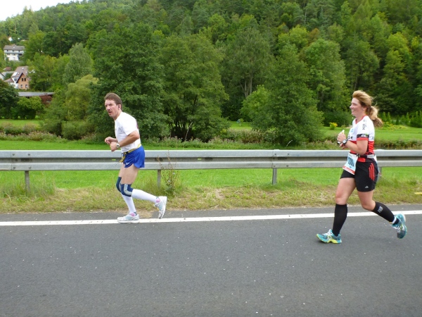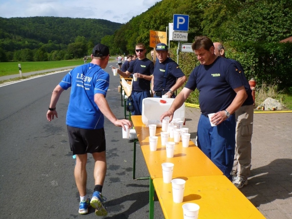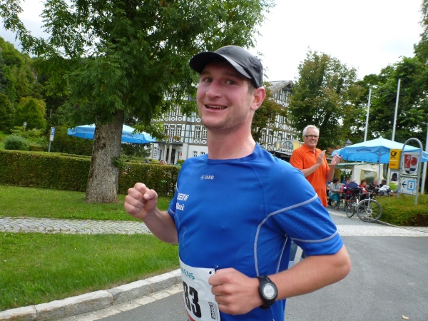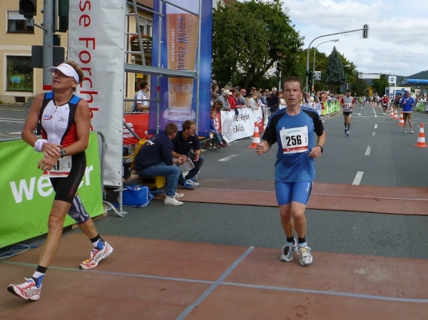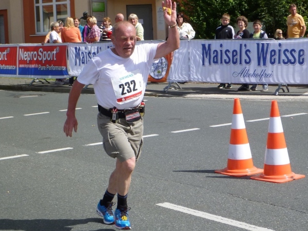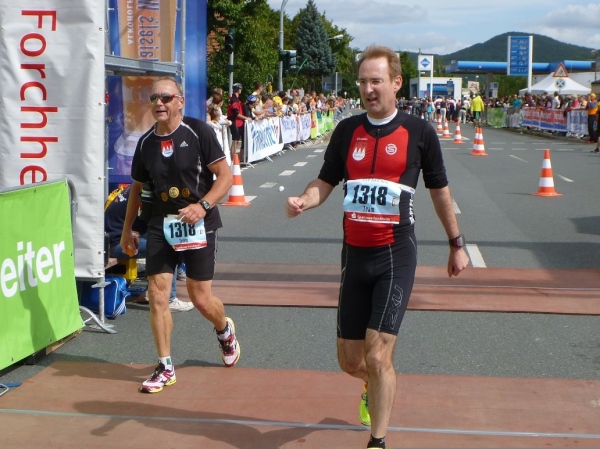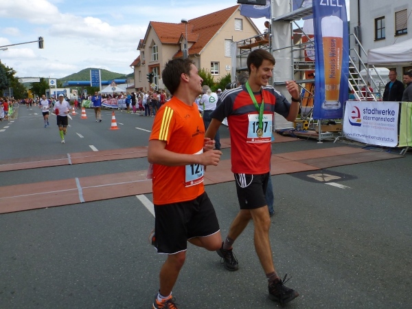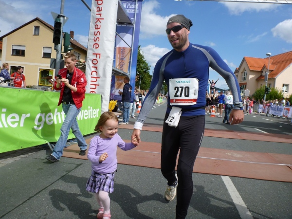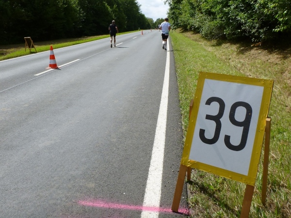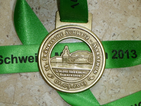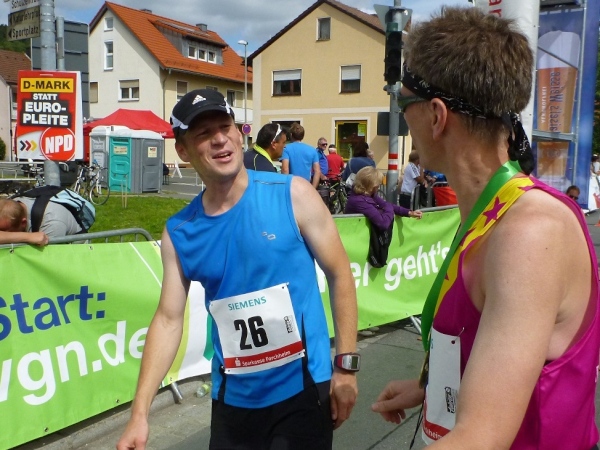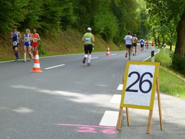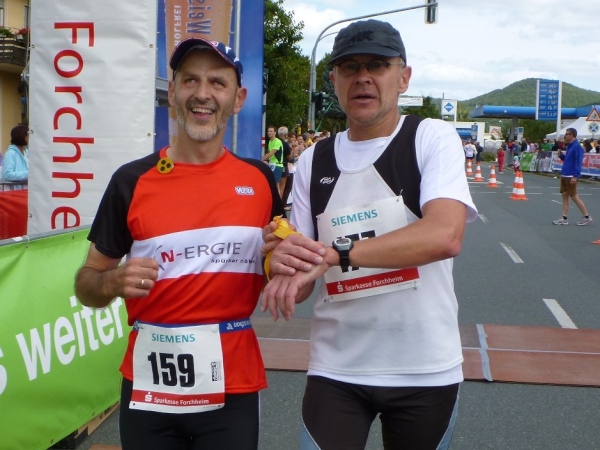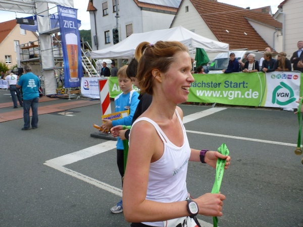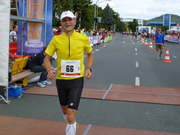 Ein, zwei Teamläufer kommen von hinten, mehr sind es nicht. Es macht Spaß am Ende loszulegen. Die letzten zwei Gegenanstiege ziehen sich noch hin. Dazwischen kann man an der letzten V-Stelle bei Kilometer 40 auftanken. Das Super (Bier) ist da nicht vorhanden, so dass ich ohne Stopp mein Tempo hoch halte und es fast in Schussfahrt Richtung Ebermannstadt rollen lasse. Und dann geht es durch das Ziel, ich bin voll zufrieden, denn ich erkenne eine 3.37 Stunden. Das passt.