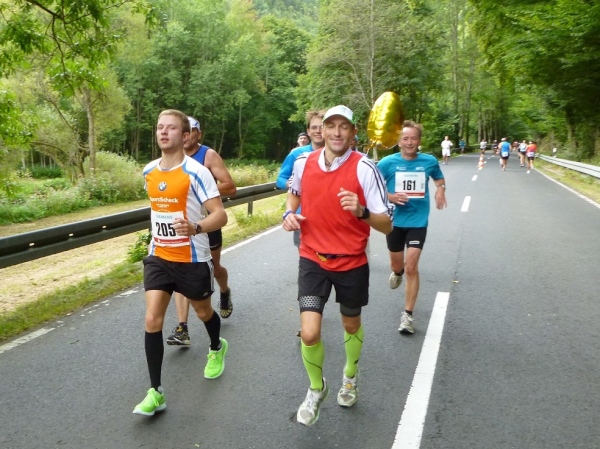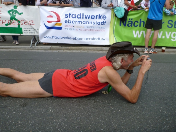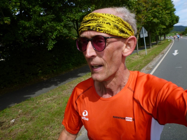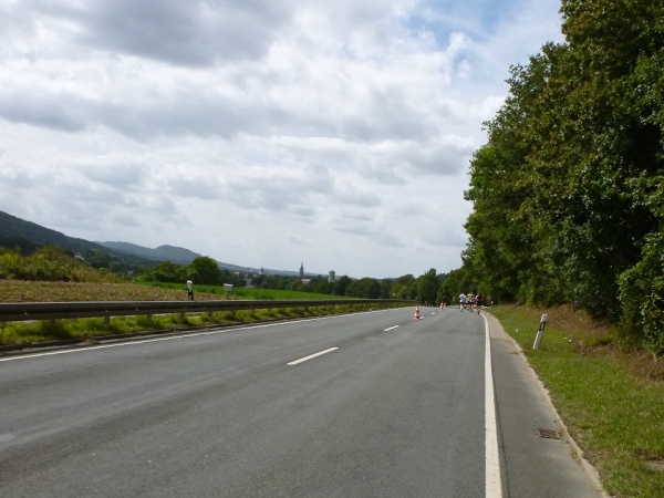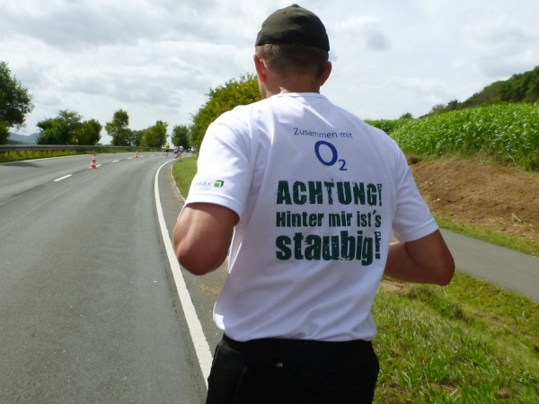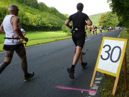 Kilometer 30, es geht nun nach Hause. Auf der anderen Straßenseite kommen nun die Zeitläufer mit ihren Gruppen entgegen. Der Alex Morschhäuser hat Glück, denn um ein Haar hätte ich ihn mit vollen Backen erwischt. Das letzte Bananenstück kann er gerade noch kurz vor dem Fotoschuss hinunterwürgen.