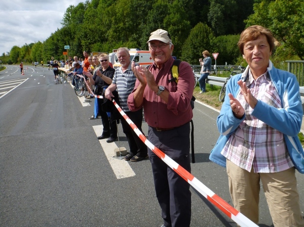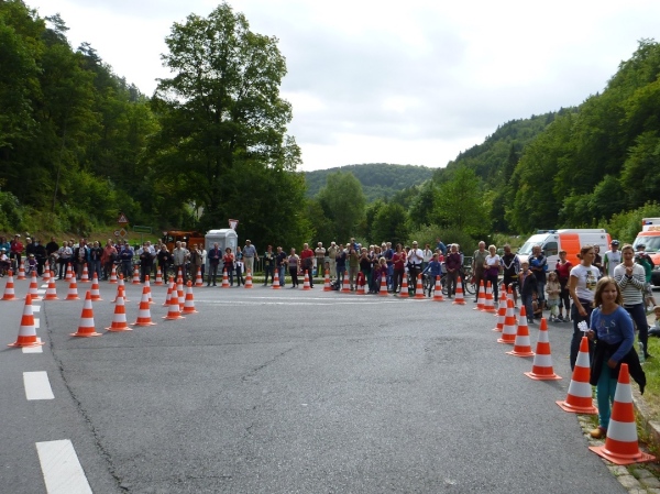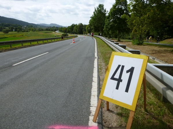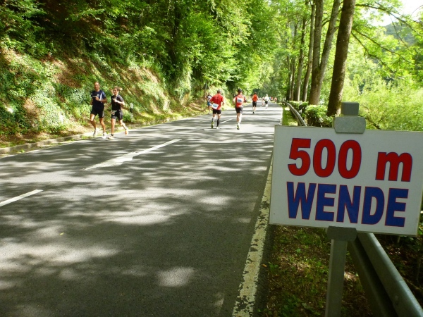 Dann kündigt sich die Wende bei der Sachsenmühle an. Noch 500, noch 300, noch 100 Meter, dann ist die Wende in meinem Blickfeld. Die Moderation und Musik von dort ist schon deutlich früher zu hören. Der Moderator versucht alle namentlich aufzurufen. Viele Zuschauer haben sich am Wendepunkt eingefunden. Ich drehe um, es geht zurück.