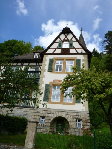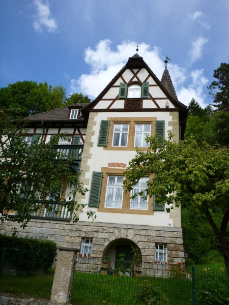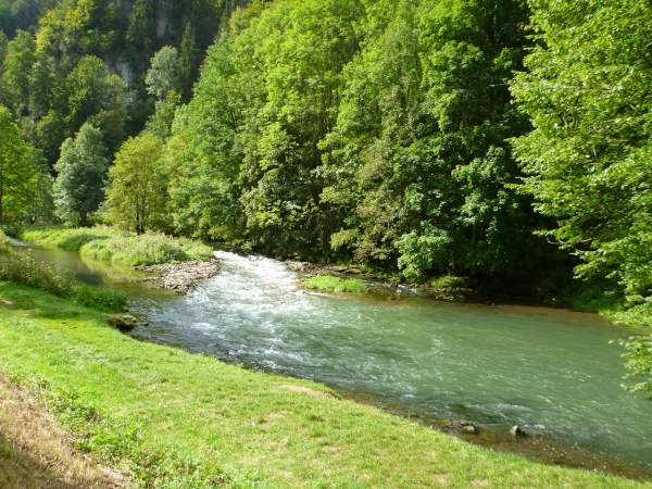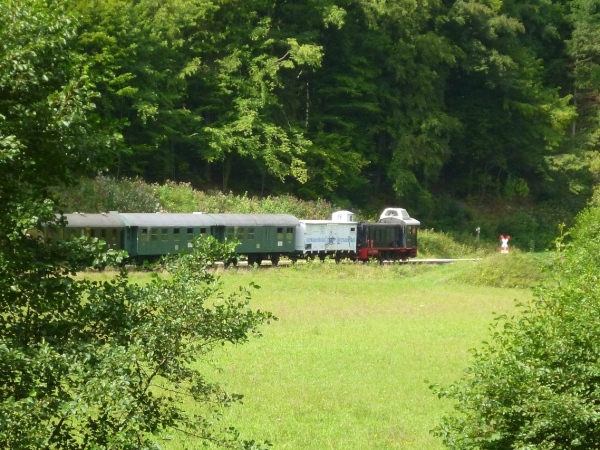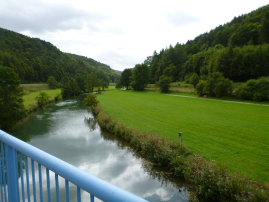 Kurz nach der Brückenüberquerung der Wiesent höre ich die Dampfbahn mit einem Pfeifen entgegenkommen. Sie kommt aus Behringersmühle herunter und mir später gut vor die Linse. Die Felsformationen rücken nun dicht an die Straße heran, vereinzelt sind Schutzzäune angebracht, die verhindern sollen, dass loses Gestein auf die Straße fällt.