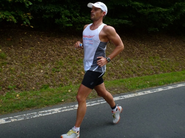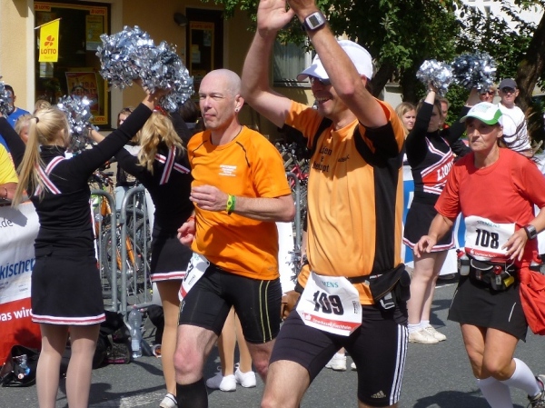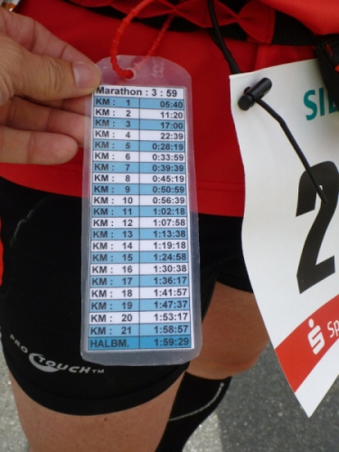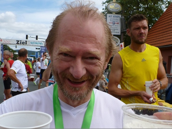 Jochen Brosin, der Querläufer, wartet schon mit einem Weizen in der Hand auf mich. Iso, Cola, Riegel und Obst warten im Zielbereich auf die Abnehmer. Was sagt mein Zeiteisen? 3.37.29, die zweite Hälfte bin ich gut fünf Minuten schneller gerannt als die erste. Perfekte Bedingungen: Temperaturen um 15 Grad, zum Ende hin mit mehr Sonne. Einzig der Wind störte ein wenig nach der Wende.