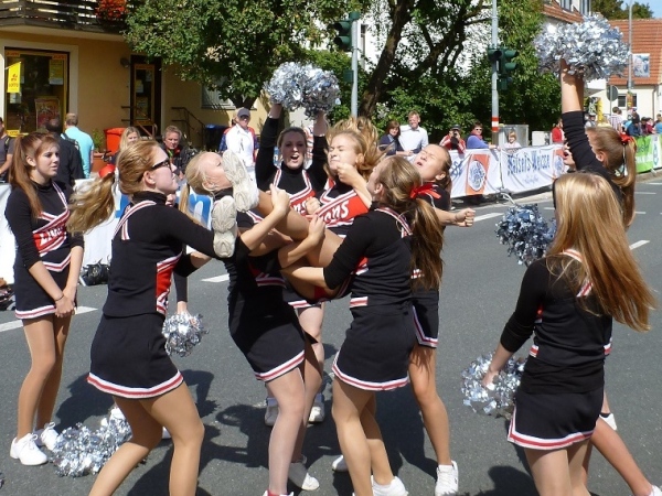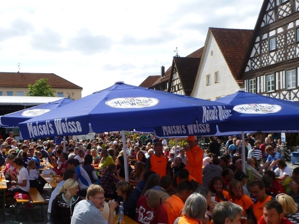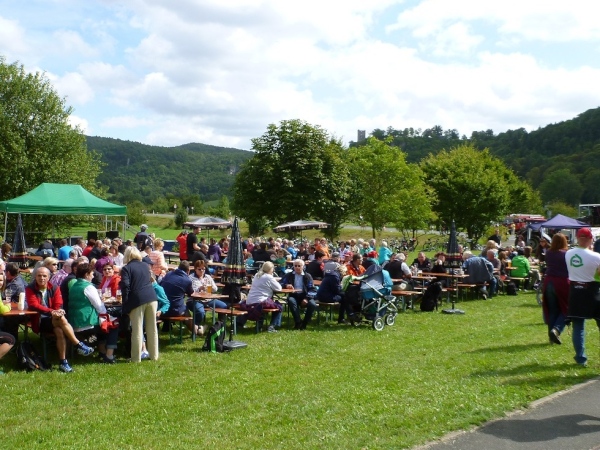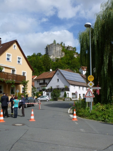 In Streitberg würden jetzt beide Tänzerinnen auf ein Posing mit den Fotografen warten, aber der zieht nach dem erfolgreichen Zielen mit der Kamera weiter. Das Marathonfest vor dem Festgelände ist im vollen Gange. Freie Bänke und Tische sind Mangelware. Damit auch die volle Distanz zurückgelegt wird, drehen wir eine kleine Ortsrunde in Streitberg. Im Ortskern kann ich einen Blick auf die Streitburg werfen, nur, ich muss meinen Kopf weit zurücklegen, denn die Burg liegt weit oberhalb des Ortes. Noch vier Kilometer.