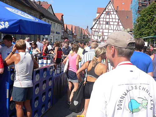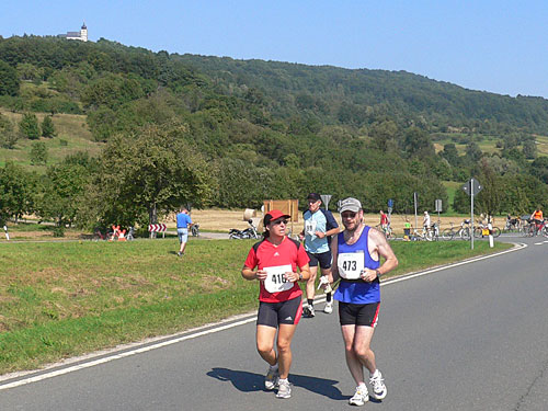 In Streitberg sind die Samba-Tänzerinnen noch immer aktiv. Wir verlassen kurz die B 470 und laufen rechts durch den Ort. Der ist menschenleer. Alle Einwohner haben sich auf dem Festplatz versammelt und genießen dort den Sommertag bei Weißbier, Bratwürsten und Grillhaxen. Nur ein kurzes Stück weiter liegt Gasseldorf. Ich glaube, auch hier ist der gesamte Ort an der Straße versammelt und feiert. An der Verpflegungsstelle machen Rainer und Maria Dienst und verzichten heute auf das eigene Laufvergnügen.