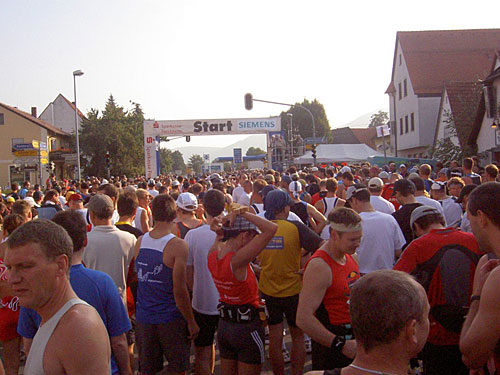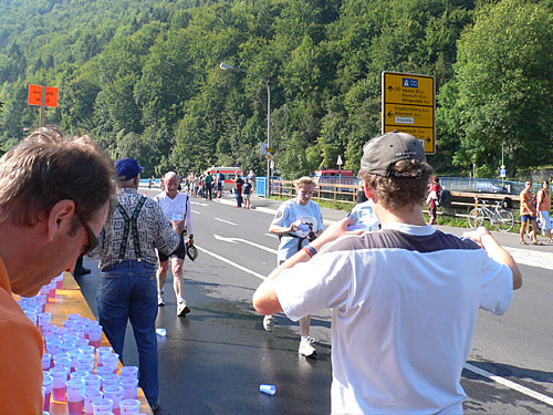 Hier auf dem Paradeplatz herrscht Volksfeststimmung. Die Verpflegung ist klasse. Wasser, Iso, Bananen, Schokoriegel, Weizenbier und …Cola. Wie froh wäre ich gewesen, ich hätte an den letzten zwei, drei Getränkestationen eine Cola bekommen.