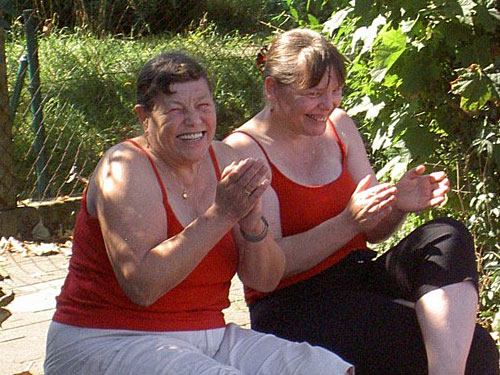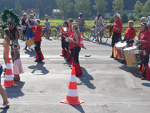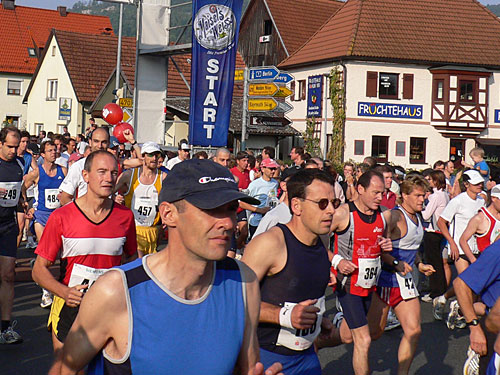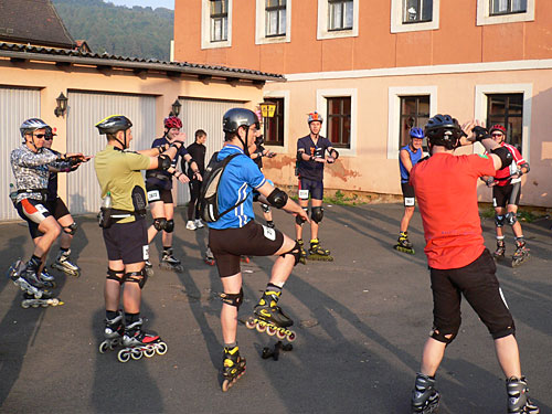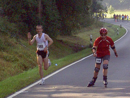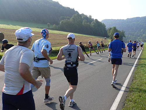 Der Fränkische Schweiz Marathon ist bei Skatern besonders beliebt, was die über 700 Anmeldungen deutlich belegen. Sie bestimmen hier zunächst eindeutig das Geschehen. Ich beobachte die Buntgekleideten und ihre Rituale. Eine Gruppe hat sich vor dem Gasthof versammelt. Die „Chefin“ lässt einen Kreis bilden und bittet zur Aufwärmgymnastik. Die deutschen Schlager aus dem Lautsprecher passen dazu nicht. Als richtige „Chefin“ ist sie darauf aber vorbereitet. Casettenrekorder und Minilautsprecher sind im Nu aufgebaut und los geht’s. Der erste Applaus des Tages geht an sie.