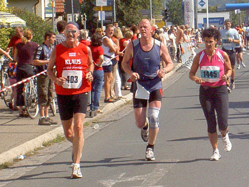 Nach 500 Metern gebe ich die Rote Laterne ab und noch einmal 500 Meter weiter, bei der ersten Steigung, überhole ich den Pacemaker 4:30 mit seinem Gefolge. Ich höre noch so etwas wie „... bergauf immer langsam, nicht wie der Spinner da“ und habe kurz darauf Eberhard eingeholt. Allerdings bin ich auch ziemlich außer Atem. So bin ich einen Marathon auch noch nicht angegangen.