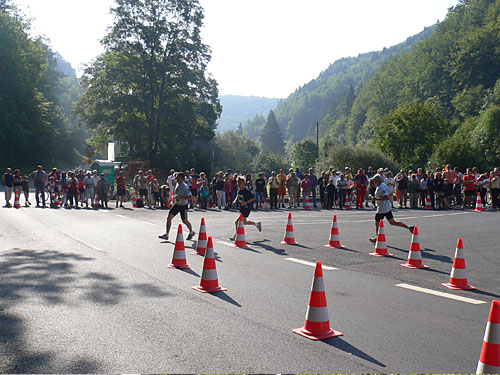 Links liegt Streitberg. Eben kommt mit einem Affenzahn Benjamin Zschätzsch auf seinen Inlinern aus dem Ort und biegt auf die B 470 ein, um zurück nach Ebermannstadt und dann nach Forchheim zu düsen. Nach 1:08 Stunden wird er dort als Erster einlaufen.