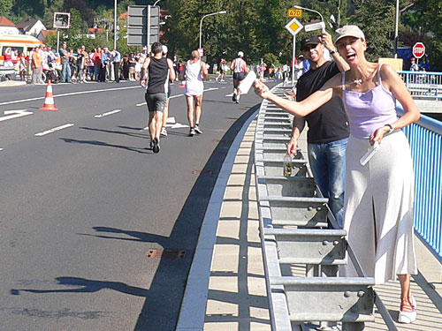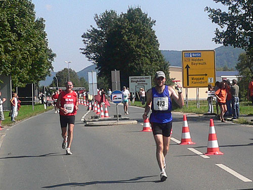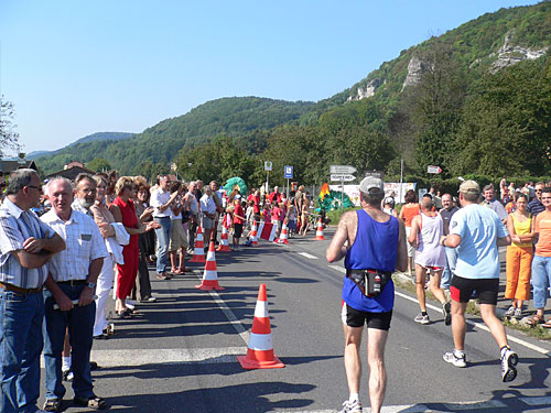 Auf der B 470 herrscht reger Verkehr. Neben den annähernd 500 Marathonis sind fast 300 Läuferinnen und Läufer auf der 26 km-Strecke. Dazu kommen fast 300 Teams, die sich die Marathonstrecke (26 und 16 Kilometer) teilen. Zu unterscheiden sind sie durch verschiedenfarbene Startnummern. Es kommt keine Langeweile auf. Ein Schwatz ist immer drin. Aber auch der Radweg, der abwechselnd entlang der Wiesent oder der B 470 verläuft, ist gut besucht. Ganze Familien sind mit Rädern oder auf Rollen unterwegs. Sie klappern so ein Straßenfest nach dem anderen ab. Und zwischendurch werden die Läuferinnen und Läufer mit flotten Sprüchen und Anfeuerungsrufen aufgemuntert.