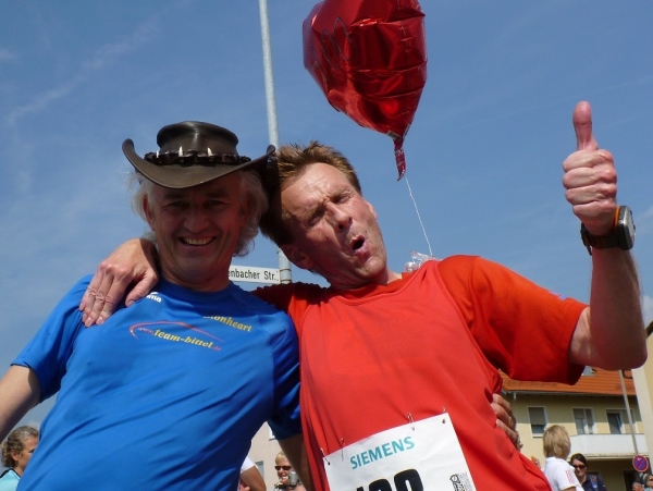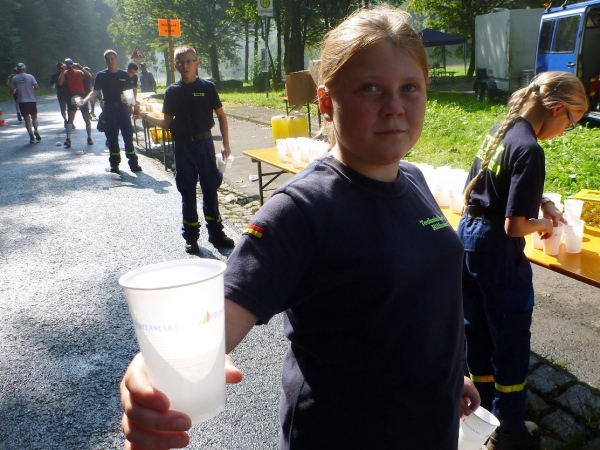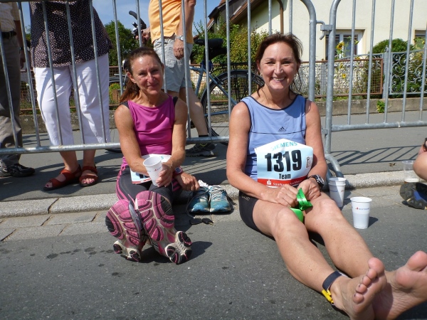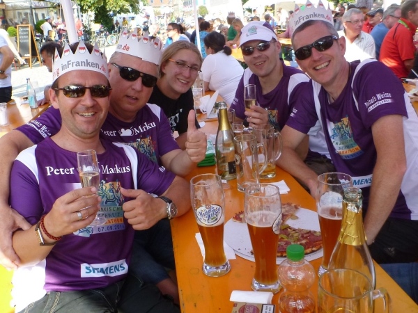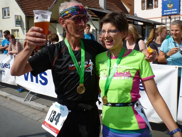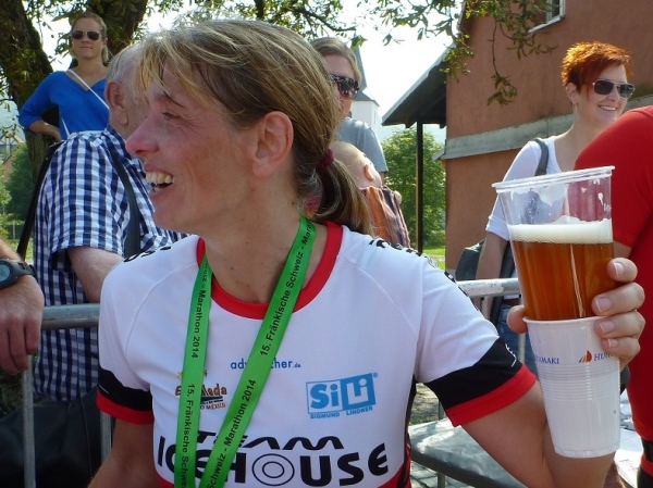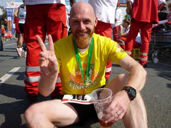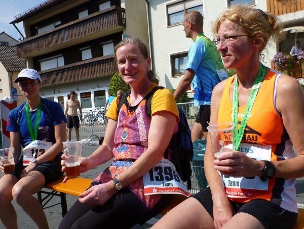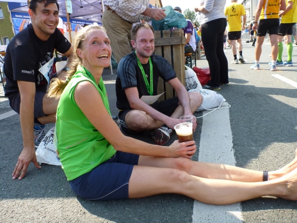 Im Ziel warten Henriette und Erwin, der jetzt nicht mehr als Wasserträger fungiert, sondern den Job als Oberkellner übernommen hat. Jeder Pacer und auch der durstige Reporter bekommt ein kühles Weißbier überreicht. Bei 25 Grad eine Wohltat.