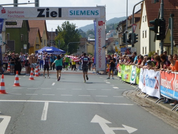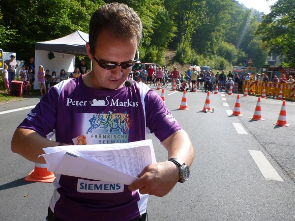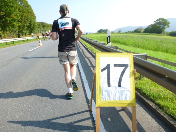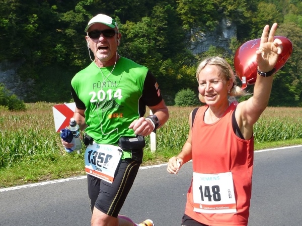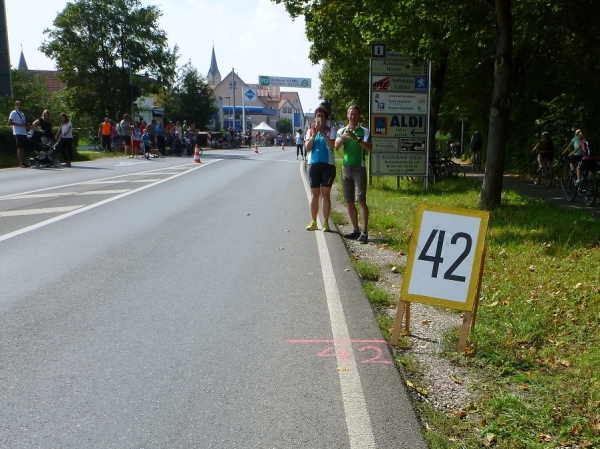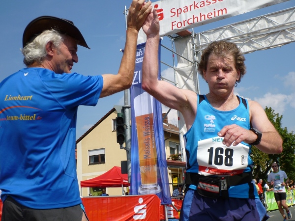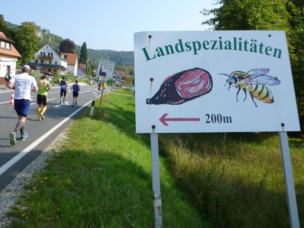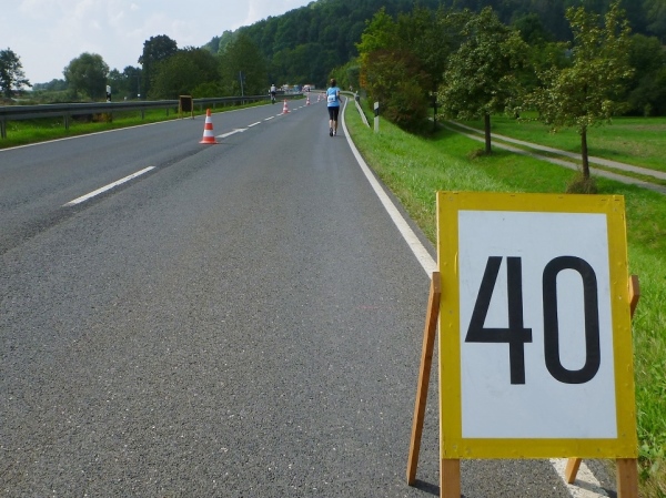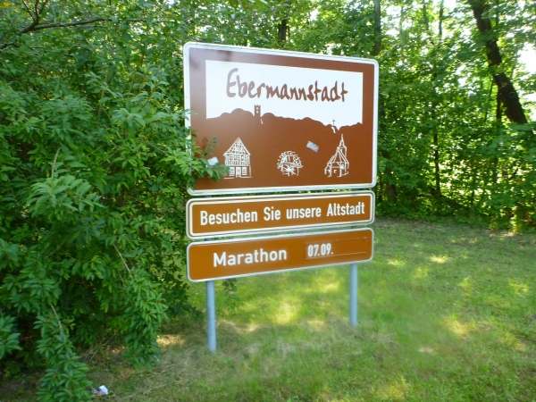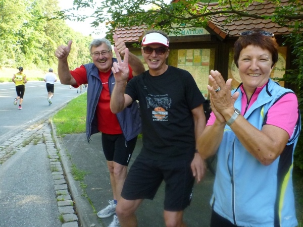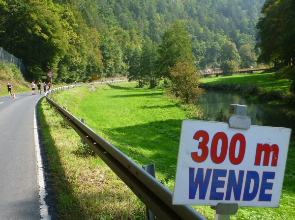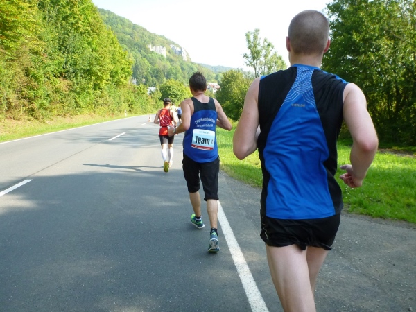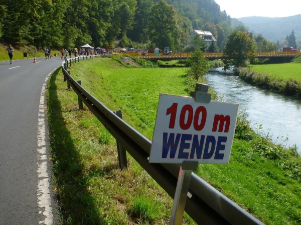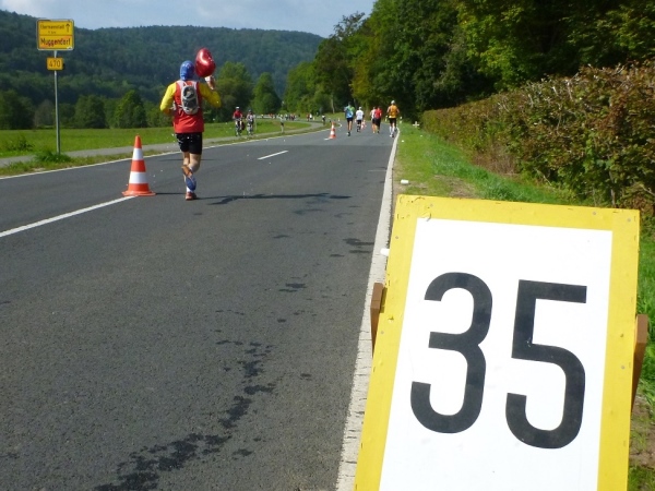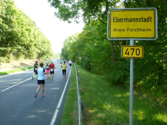 500, 300 und 100 Meter Wende, so wird die Umkehrstelle angekündigt. Der 3.30er Pacer ist längs durch, alleine! Am Wendepunkt haben sich viele Zuschauer versammelt. Nicht wenige sind per Drahtesel gekommen. Jeder wird vom Moderator angekündigt und über viele weiß er etwas berichten. So auch über die fotografierende Rennsau, die als „ein Stammläufer“ angesprochen wird. Ich drehe um, es geht zurück. 13 Kilometer bis Ebermannstadt!
