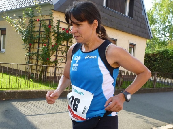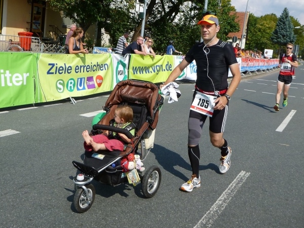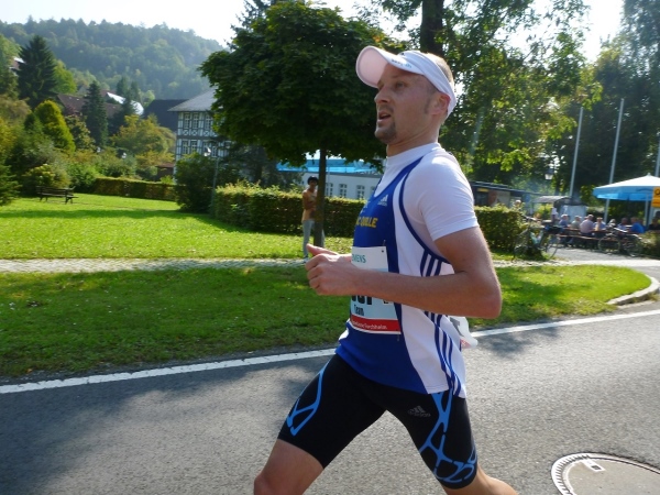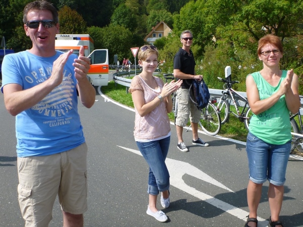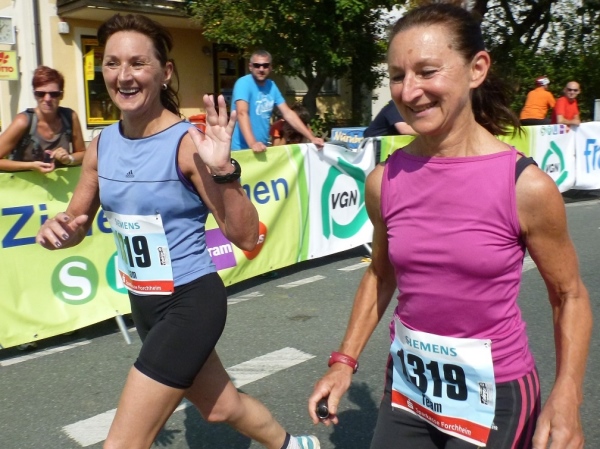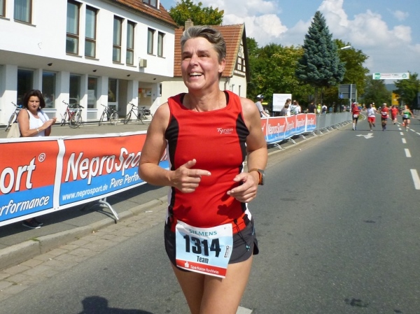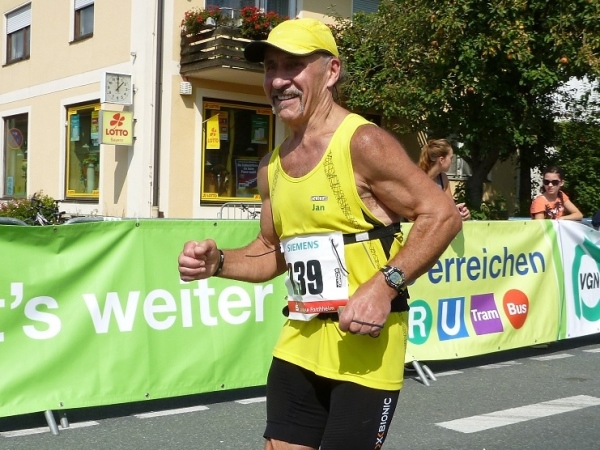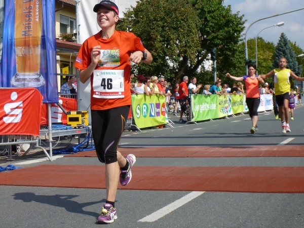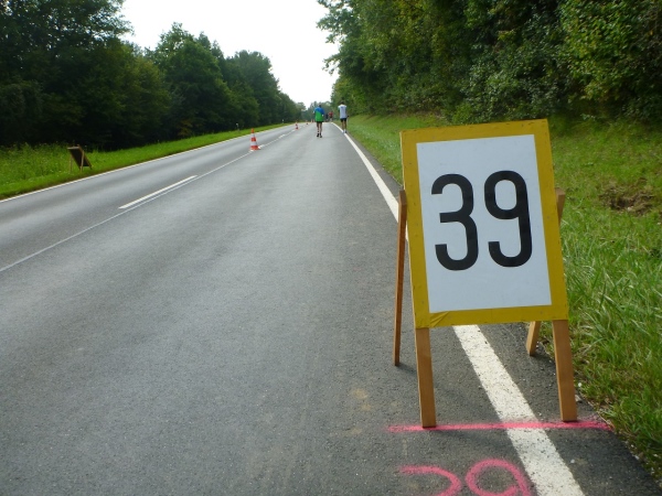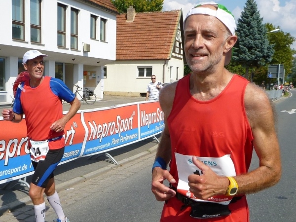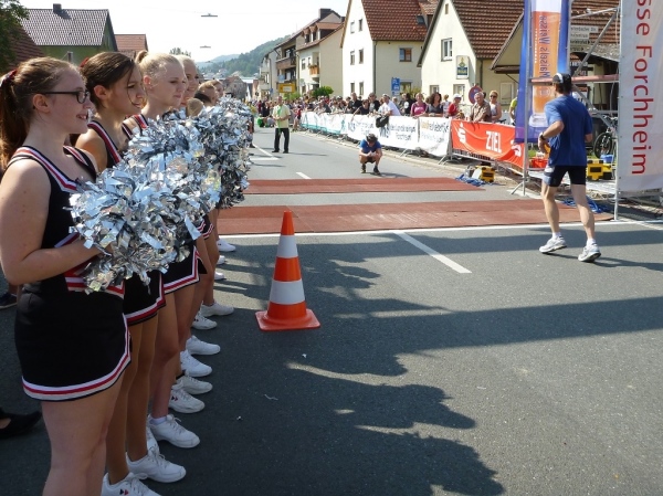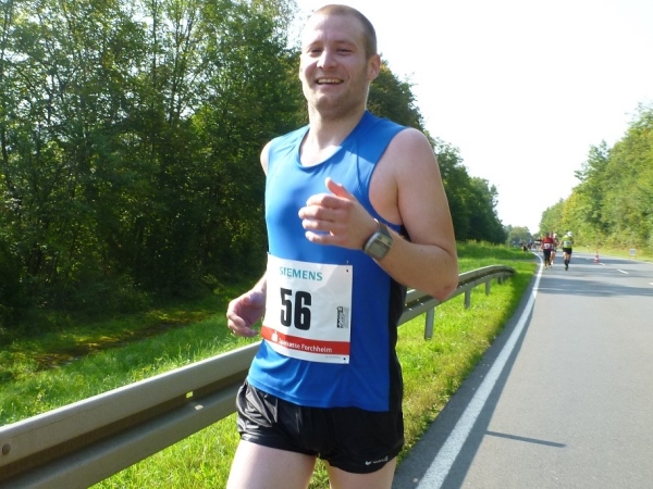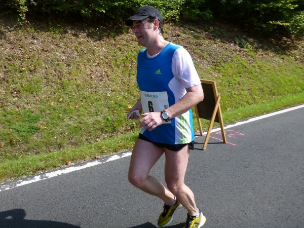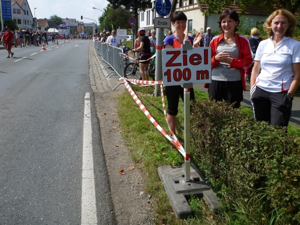 500, 300 und 100 Meter Wende, so wird die Umkehrstelle angekündigt. Der 3.30er Pacer ist längs durch, alleine! Am Wendepunkt haben sich viele Zuschauer versammelt. Nicht wenige sind per Drahtesel gekommen. Jeder wird vom Moderator angekündigt und über viele weiß er etwas berichten. So auch über die fotografierende Rennsau, die als „ein Stammläufer“ angesprochen wird. Ich drehe um, es geht zurück. 13 Kilometer bis Ebermannstadt!