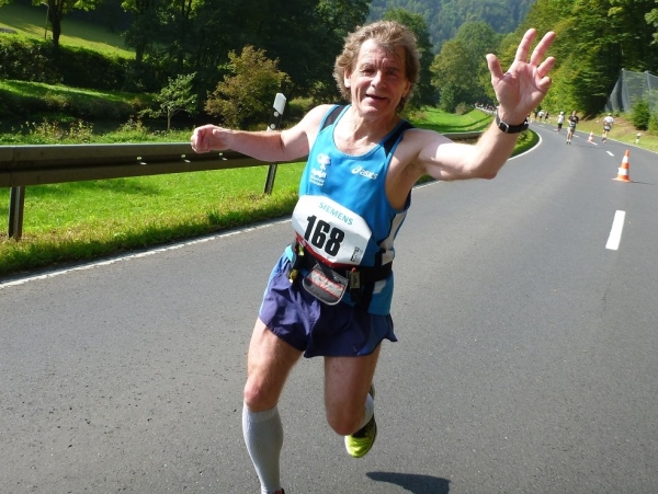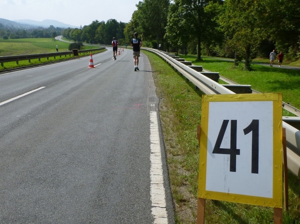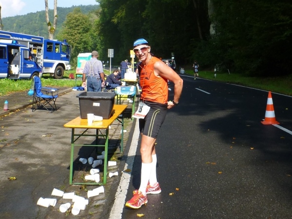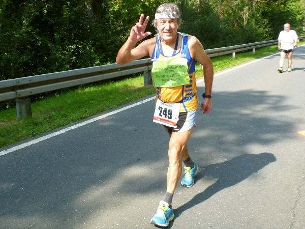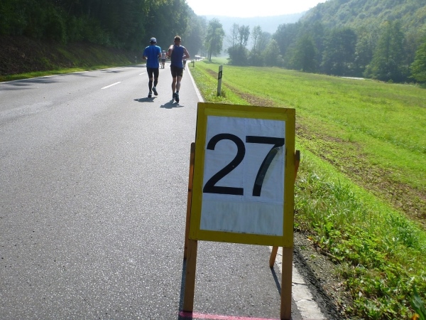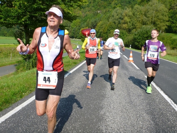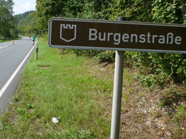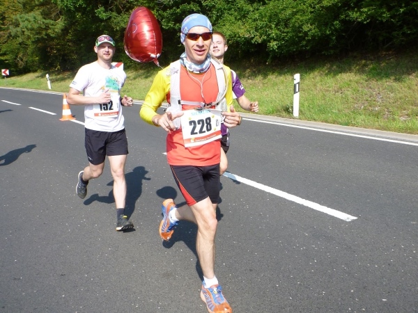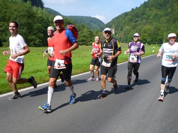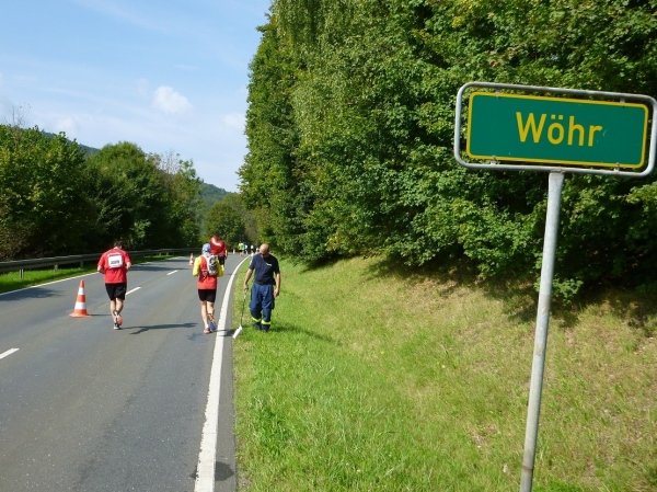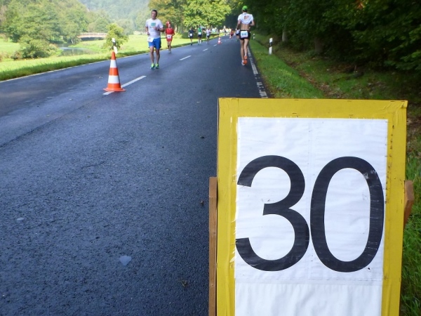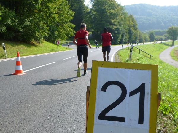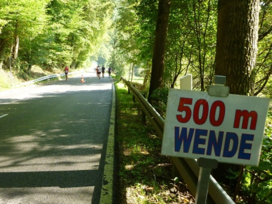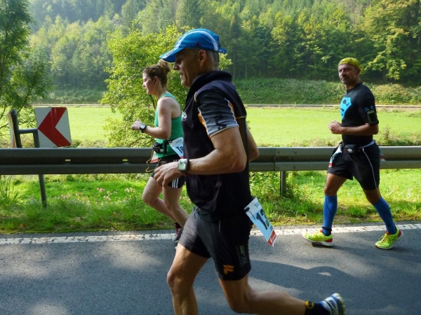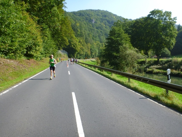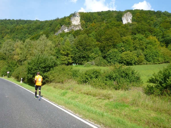 Die Felsformationen rücken dicht an die Straße heran, vereinzelt sind Schutzzäune angebracht, die verhindern sollen, dass loses Gestein auf die Straße fällt. Beim Hinweg ist das mir gar nicht aufgefallen. Der 35. Kilometer liegt hinter mir, da kommen die letzten Kämpfer auf der anderen Straßenseite entgegen. Darunter ist der M70-Läufer Djuro aus Selb, der laufenderweise kranken Kindern hilft. Dahinter dann der OK-Chef des Burgwald Marathons in Rauschenberg, Heinz Kaletsch. Alle zwei Jahre, das nächste Mal 2015, werden am Burgwald die Laufschuhe geschnürt.