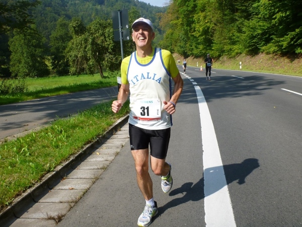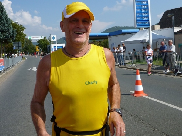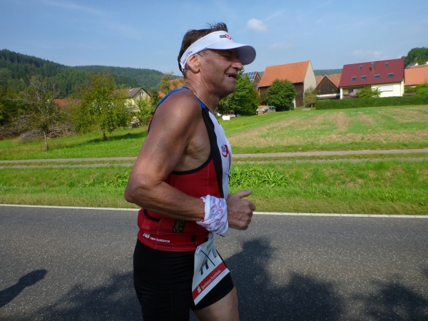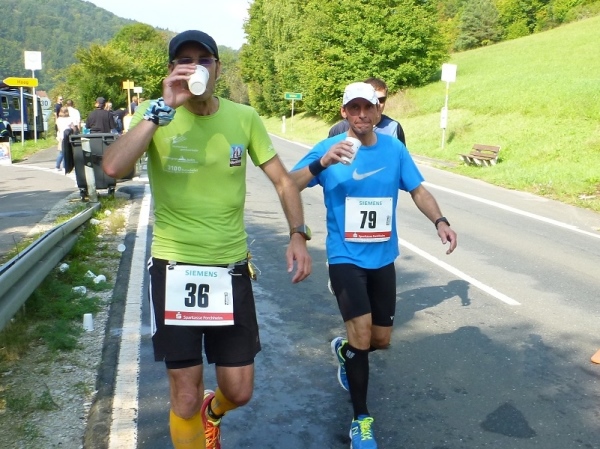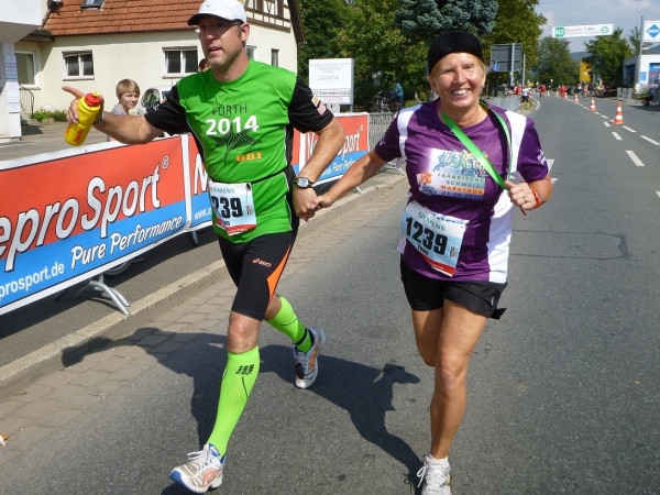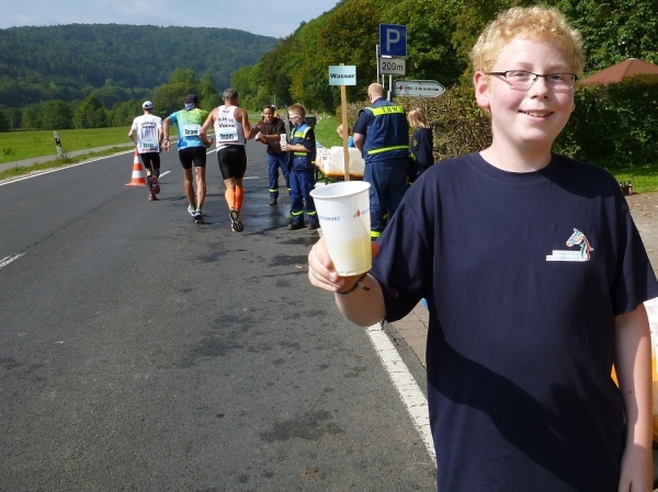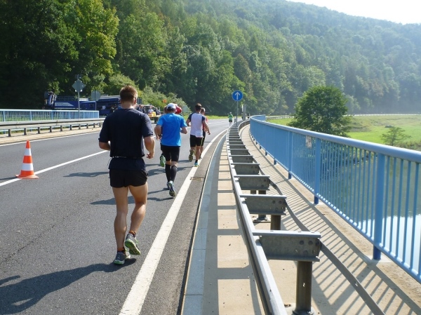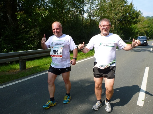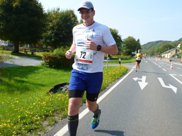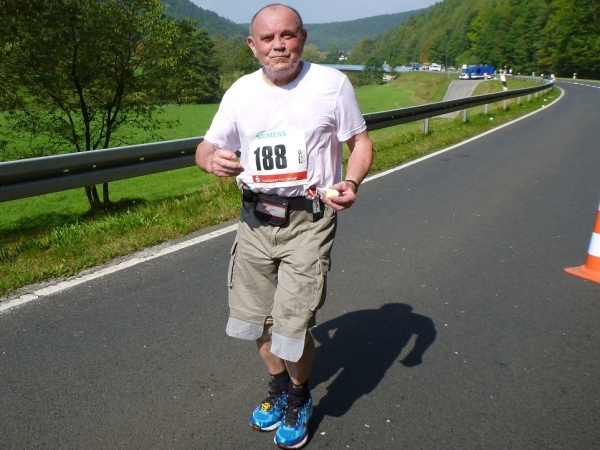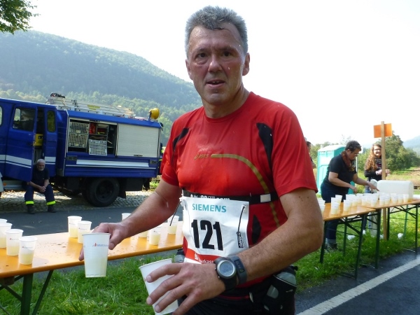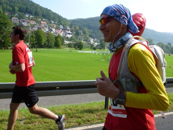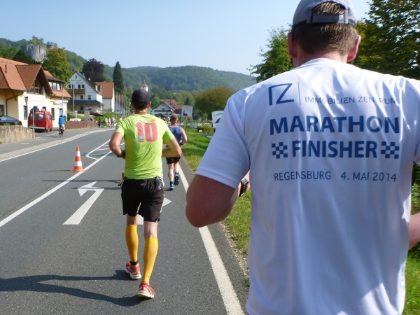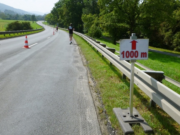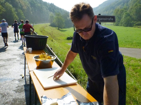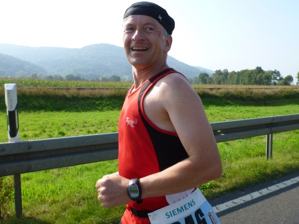 Die Felsformationen rücken dicht an die Straße heran, vereinzelt sind Schutzzäune angebracht, die verhindern sollen, dass loses Gestein auf die Straße fällt. Beim Hinweg ist das mir gar nicht aufgefallen. Der 35. Kilometer liegt hinter mir, da kommen die letzten Kämpfer auf der anderen Straßenseite entgegen. Darunter ist der M70-Läufer Djuro aus Selb, der laufenderweise kranken Kindern hilft. Dahinter dann der OK-Chef des Burgwald Marathons in Rauschenberg, Heinz Kaletsch. Alle zwei Jahre, das nächste Mal 2015, werden am Burgwald die Laufschuhe geschnürt.