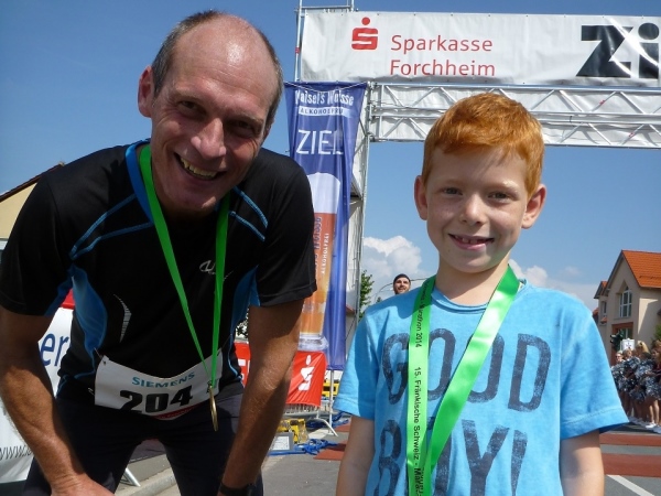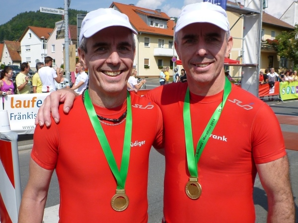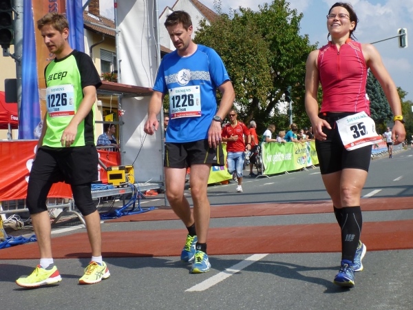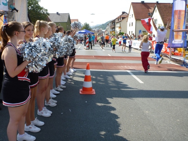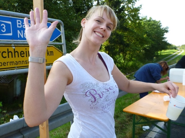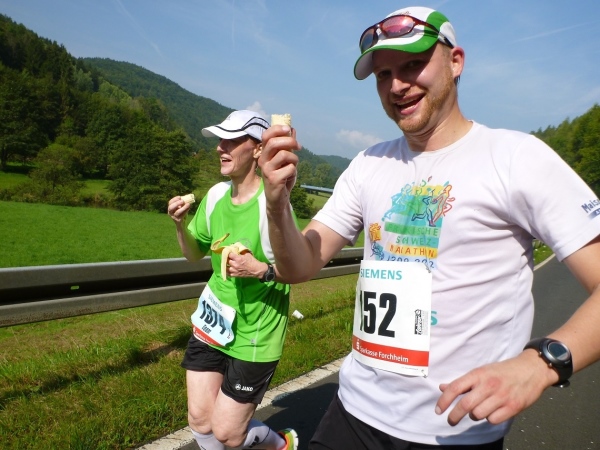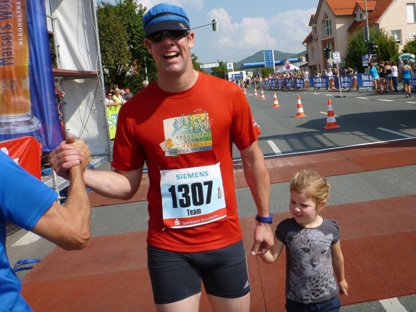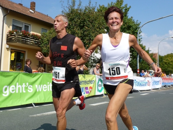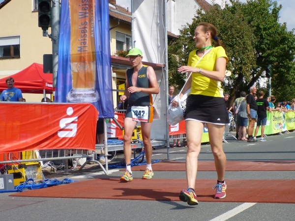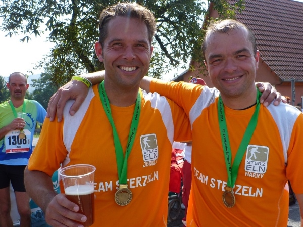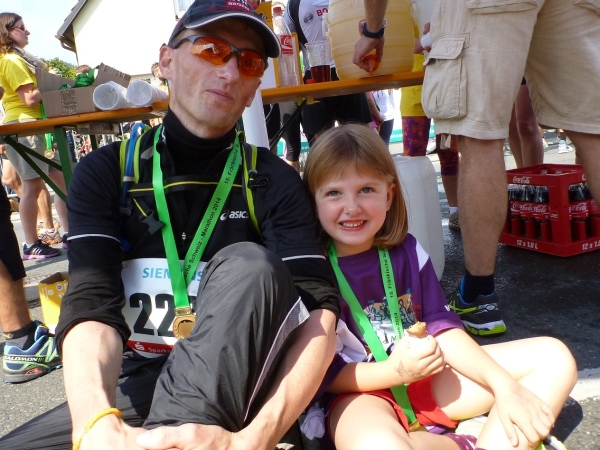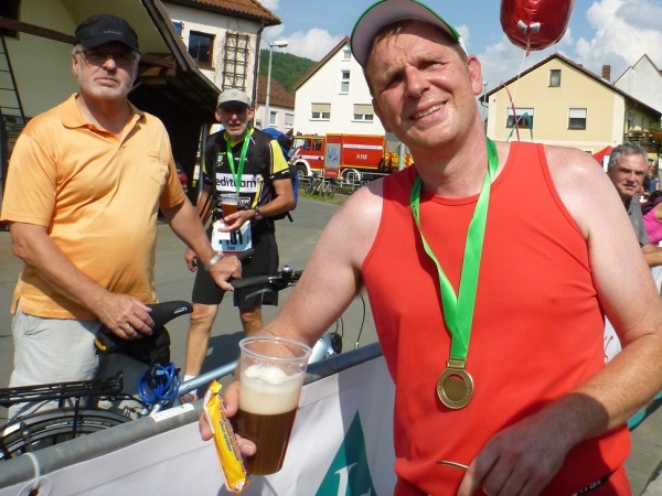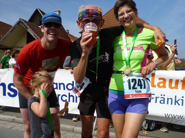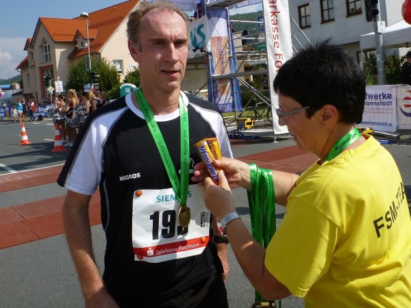 Helfer hängen den Finishern Medaillen um und übergeben kurz hinter der Ziellinie Riegel. Nur ein paar Schritte weiter können wir uns an Cola und Obst laben. Verbessern kann man sich bei den Duschgelegenheiten, denn das Wasser in der Schule ist, ich zitiere einen Einheimischen, arschkalt. Aber sonst ist der eingeschlagene Weg goldrichtig im Frangnland.