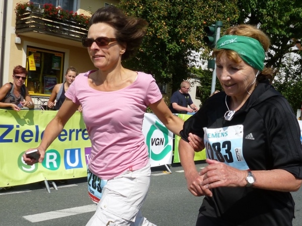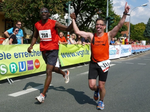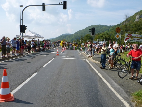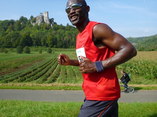Muggendorf, jetzt kommt uns bereits der erste schwarze Renner entgegen. Es ist Getachew Endisu, er gewinnt den Marathon mit vier Minuten Vorsprung. Das Tal verengt sich nun wieder. Ich höre die Dampfeisenbahn mit ihrem Gepfeife. Sie kommt aus Richtung Behringersmühle. Die Kilometer fliegen nur so dahin, die Wende ist nicht mehr fern.