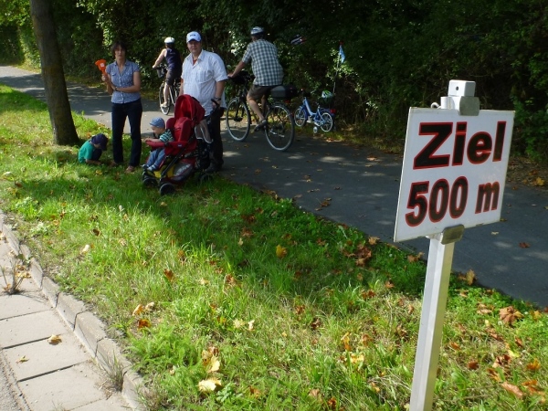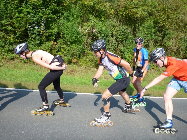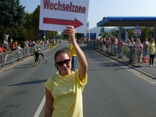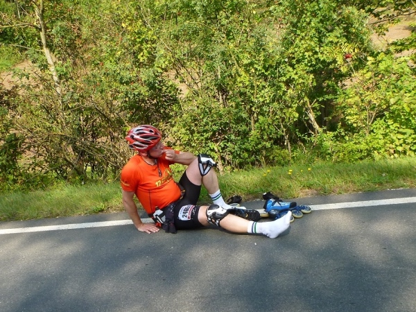 Auf der anderen Seite ist die Spitze der Inliner längst im Ziel, dennoch kommen immer wieder Gruppen im Karacho vom Gasseldorfer Berg heruntergesurrt. Die Gasseldorfer feiern mit dem Marathon ihr Straßenfest bei Bier und Bratwurst. Später sehe ich einen Skater am Straßenrand mit einem kaputten Sportgerät sitzen. Es schaut so aus, als muss er aufgeben.