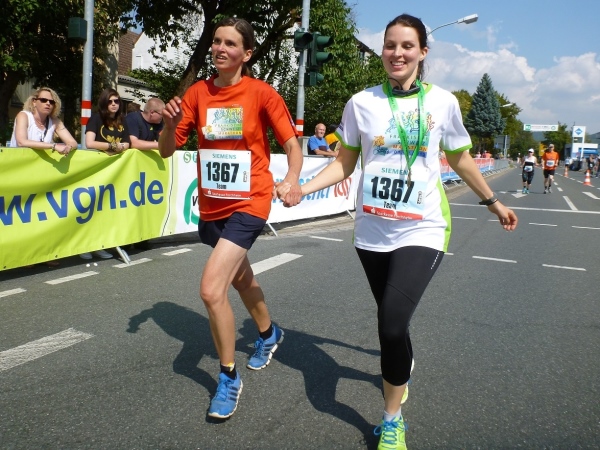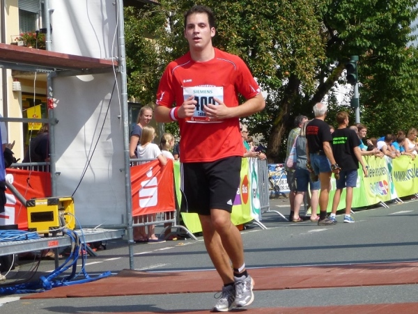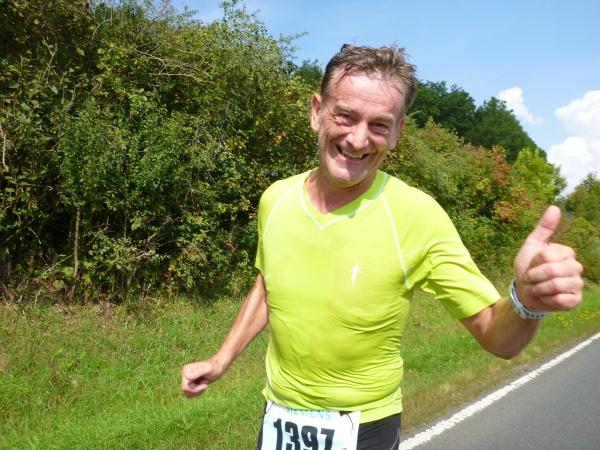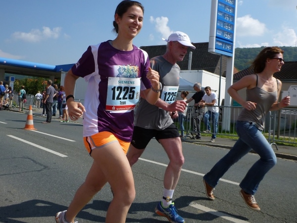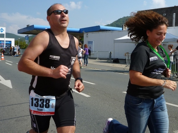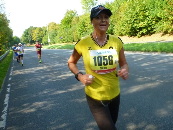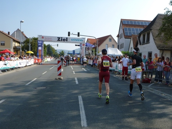Die 16- Kilometer-Läufer haben bereits ihren Endspurt angezogen, genauso wie die Teamläufer, die nach rechts ausgeleitet werden und ihren Chip an eine frische Kraft weiterreichen. Viele Zuschauer und Betreuer sorgen wir gute Stimmung. Einige 10000 Zuschauer werden auf der gesamten Strecke stehen. Für einen Landschaftsmarathon eine sensationelle Marke.