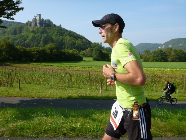 Das Wiesenttal wir weiter. Wir erreichen Kilometer 21, wo die Zwischenzeit von mika-timing genommen wird. In einem Rechtsbogen umrunden wir nun die Burg Neideck, die auf einem Sporn des Wartleitenberges liegt. Die Gruppe um 3:45er-Pacer Leon lässt sich das laufende Foto-Shooting nicht entgehen. Einige grinsen und winken.