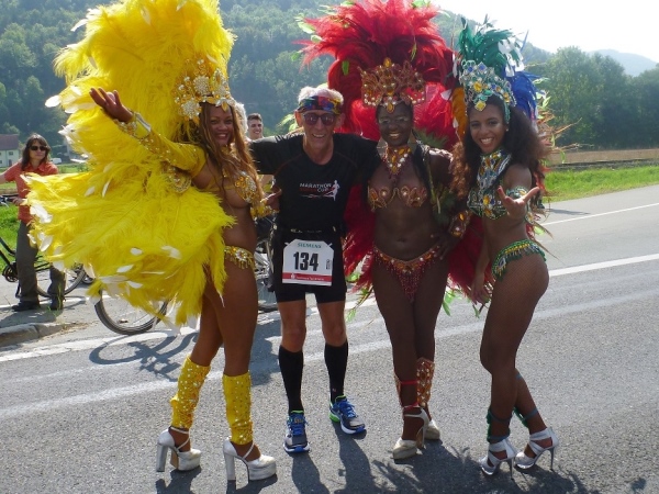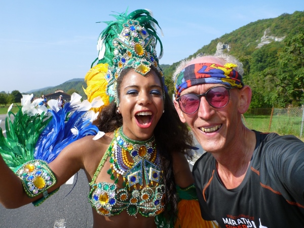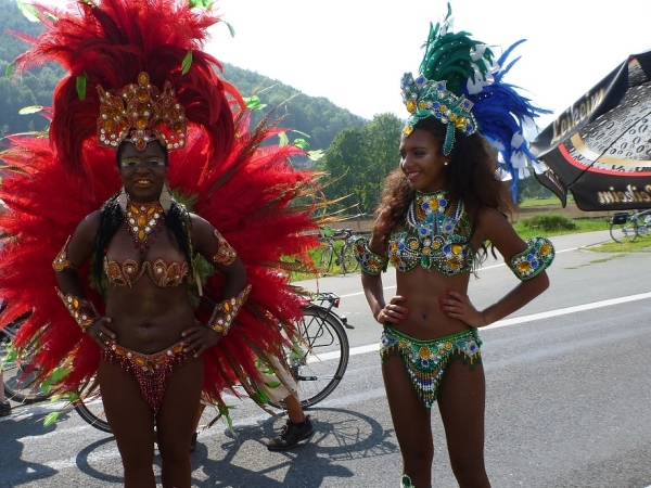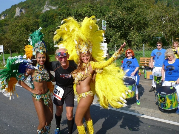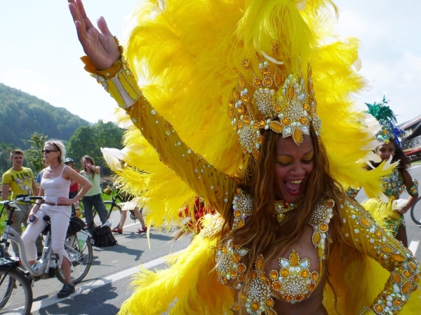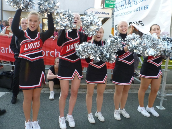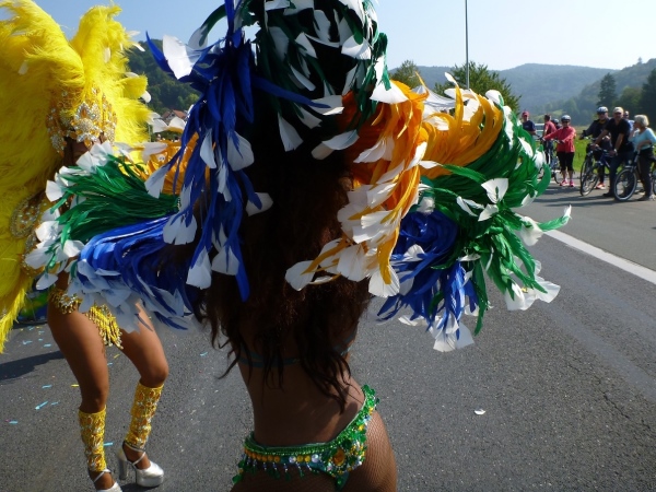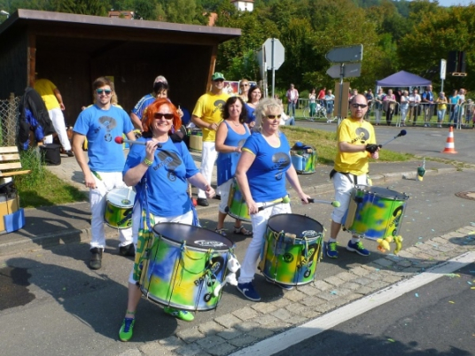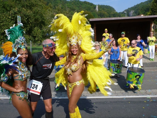 Die Geräuschkulisse wird lauter, an der Einfahrt zu Streitberg haut eine Sambaband in die Vollen. Und drei rassige dunkle Sambatänzerinnen schwingen ihre Hüften. Gut, dass Alex weiter hinten läuft, ich habe freie Auswahl. Ich fuchtle mit der Kamera herum und eine der Mädels tanzt vor mir herum. Mir wird davon schwindelig und ich weiß fast nicht mehr, wohin ich schauen soll (muß). Die Fotoarbeit nimmt mir der Bandleader ab. Danke. Letztes Jahr musste ich mich vom Moderator vorhalten lassen, mich mit Nebensächlichen zu beschäftigen. Heute sagt er nichts.