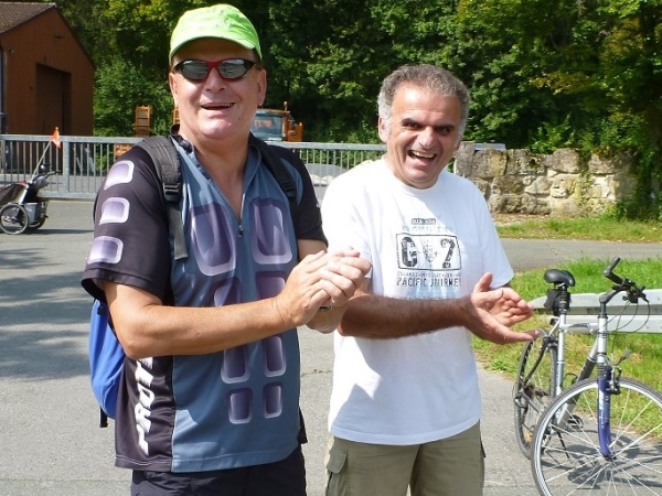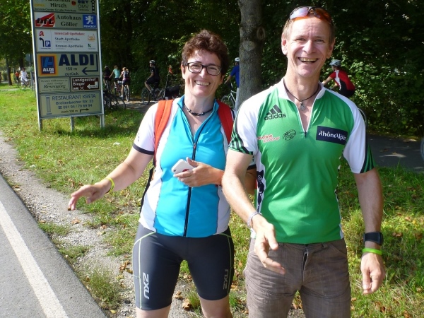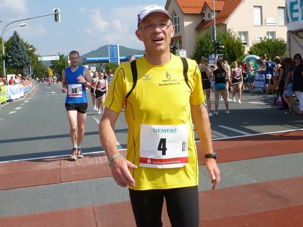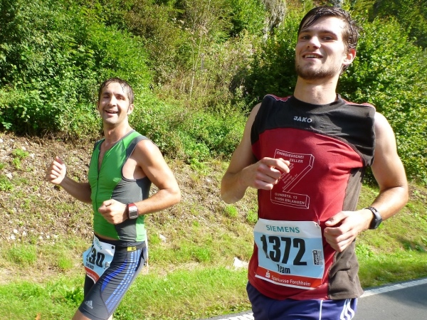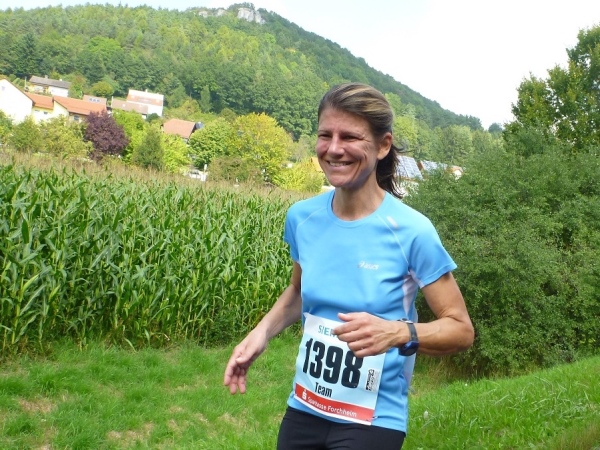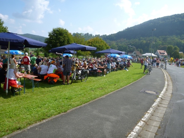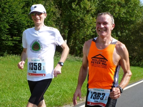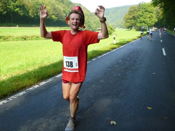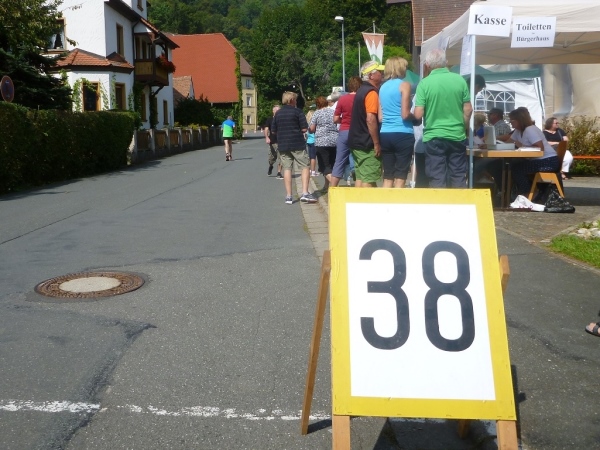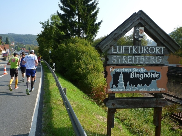 Der Großenseebacher Rudi ruft mir ein Servus entgegen. Letztes Jahr sind wir in Zeil am Main einige Kilometer miteinander gerannt. Der M60-Läufer ist flott unterwegs und wird später auf dem Trepperl landen. Es dauert nur einige Momente, dann kommt Alex auf der anderen Seite daher, auch er alleine. Das wird ihm recht sein, denn dann kann er sich frei entfalten, beim Bierschnorren und beim Posieren in Streitberg. Stimmt's Alex?