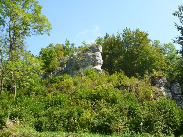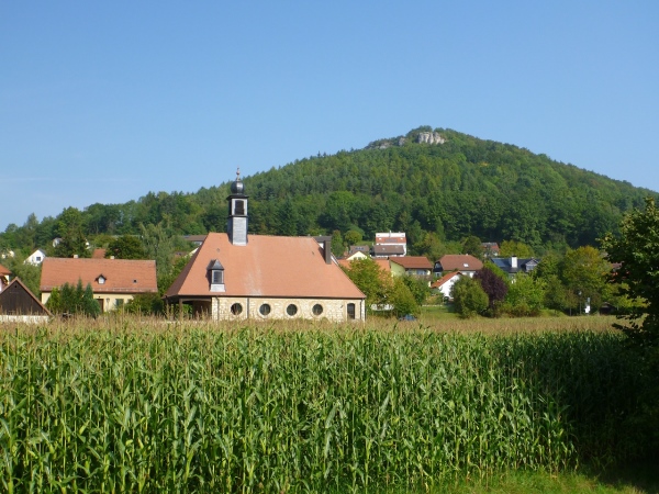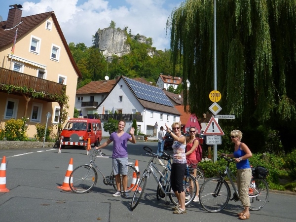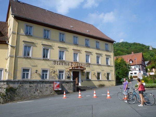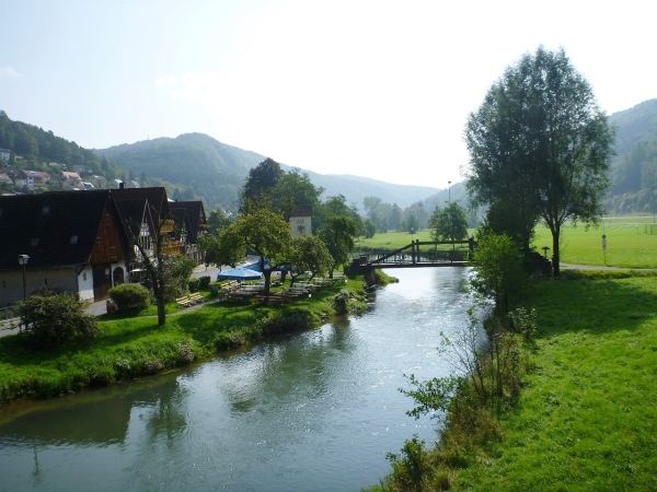 Das Wiesenttal verengt sich nun zunehmend, Streitberg wird sichtbar. Erst wird die Binghöhle, eine der schönsten Tropfsteinhöhlen in Deutschland, angekündigt. Dann könnte man Spezialitäten wie Schinken und Honig von seinem Ausflug mit nach Hause nehmen.