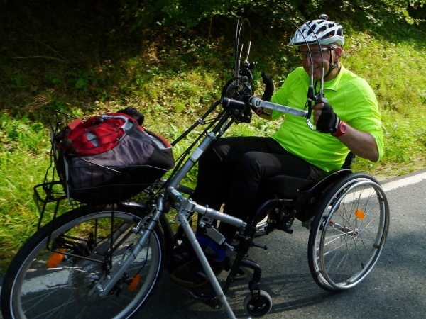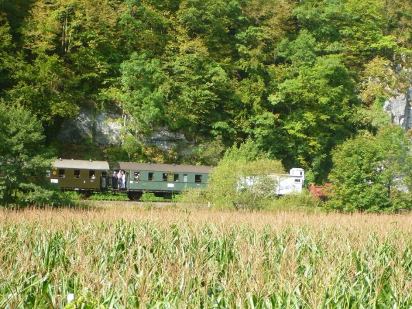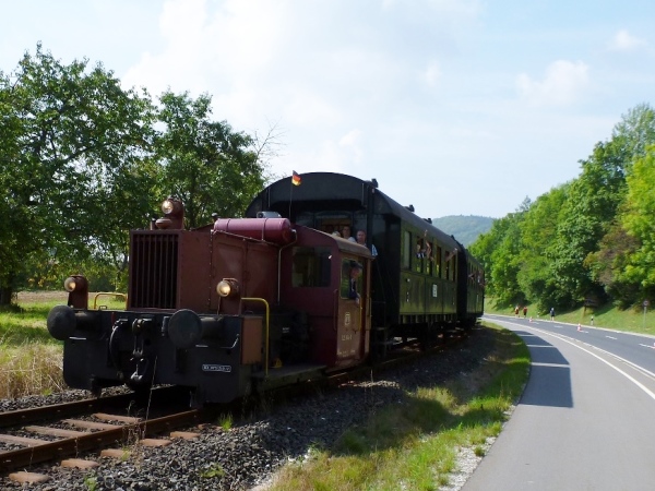 Nur noch fünf Kilometer, wieder höre ich ein Pfeifen. Jetzt kommt die Museumsbahn direkt neben der Bundesstraße herauf geschnauft. Die Bahnpassagiere klatschen und rufen mir etwas zu, was im Stampfen der Lok aber untergeht.