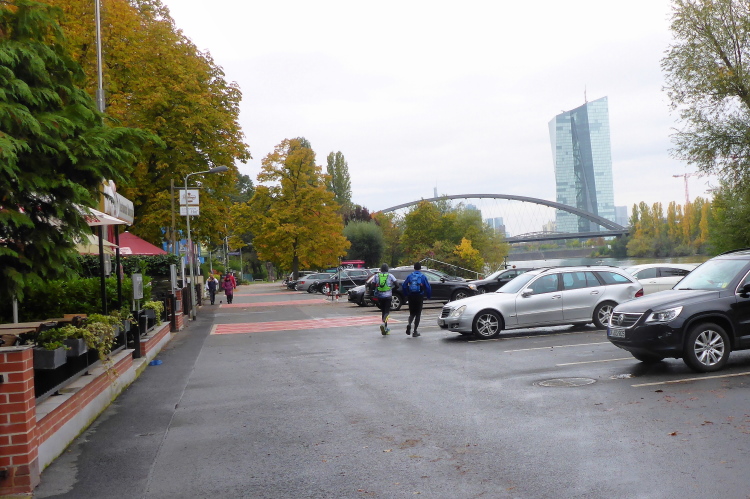 Leiden müssen wir nicht, wir laufen über die Deutschherrenbrücke, benannt nach dem Ritteroden, der seit 1552 seinen Sitz in Frankfurt hat. Fabelhafter Blick auf die Skyline von Frankfurt und gleich davor des EZB- Hochhaus, eingebettet in der ehemaligen Großmarkhalle.