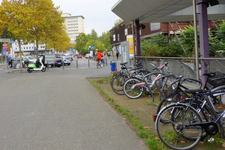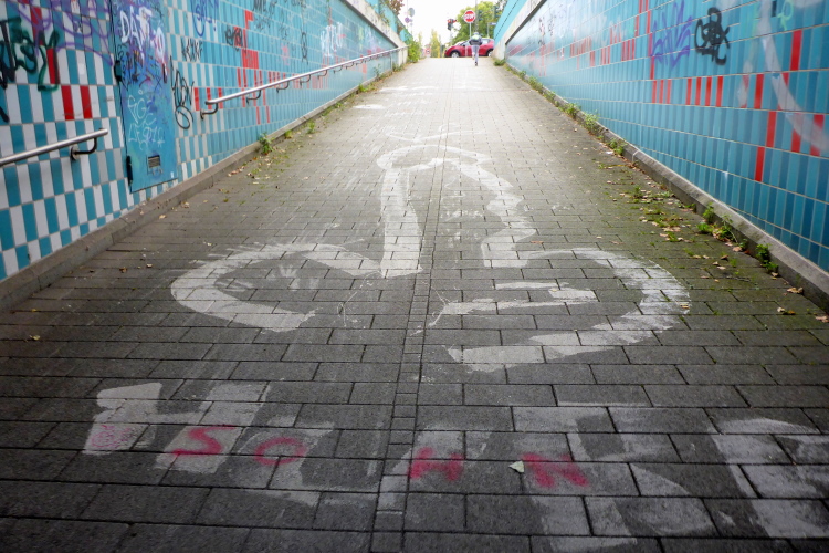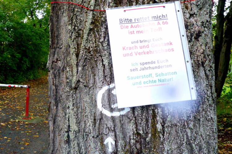 Rund um das Stadtgebiet Riederwald, das Fußballfans ein Begriff ist, ist der Weg schwer zu finden. Die A 66 wird wohl irgendwann den Anschluss an die A66 im Westen finden. Wir finden den Weg durch die Baustelle durch zweispurigen Verkehr, auf der Fahrspur, auf der uns ekelhafte Lastwagen begegnen. Keine Ampeln, keine Überwege, kein Schutz vor dem Rattern der Kraftfahrzeuge. Zwei bekloppte, nassgeregnete Typen zwischen hupenden Autofahrern. Vielleicht greift irgendwann die Verfassung des Grüngürtels.