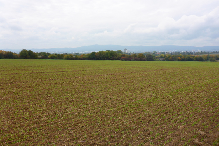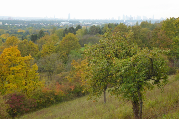 Eigentlich gehört das ehemalige Fischerdorf Fechenheim auch noch zu Frankfurt, aber da ist zu viel Industrie. Wir laufen am ehemaligen Erlenbach entlang, Richtung Bergen Enkheim - jetzt wird es schön. Der Aufstieg zum Berger Hang, einem wunderschönen Gebiet mit Streuobstwiesen, wird uns versüßt mit dem Duft der zahlreichen Haschischraucher, die hier auch ihre Entspannung finden: „Willsttu haben? Ich dir geben. Du nix kosten!“ Nette Leute, die sich hier im Schlehengebüsch versammelt haben. Unser Lauf wird schneller, nur unterbrochen für Fotosessions hinunter zur Frankfurter Skyline und vor allem zum EZB Hochhaus, das wir vor Stunden passiert habe und dessen schiefe Architektur zu denken gibt.