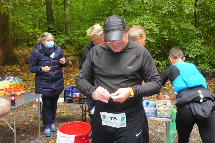 Tatsächlich ist diese Single-Trailstrecke rechts der Nidda nicht mein Ding. Erst viel später, kurz vor Heddersheim, erreichen wir festen Untergrund und unsere zweite und letzte VP-Stelle. Drei Stunden haben die Helfer hier verbracht und trotzdem noch Bier übrig. Wir sollten doch die Gurken essen, die sind scheibchenweise coronamässig in Frischhaltefolie eingepackt.