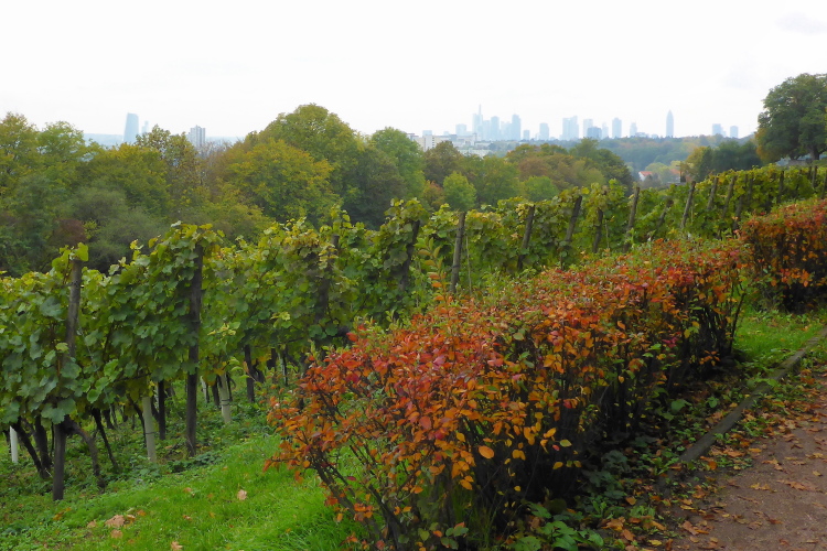 Ein Keil Kraniche fliegt über unsere schweißgebadeten Köpfe, es wird wohl bald Winter. Kurz vor dem Lohrberg holt uns Änschie ein, die bessere Änschie, die, die 68 km laufen kann. Sie übergibt uns Jens, den Besenradler, den wir ab jetzt betreuen werden. Der Lohrberg (185m) begrüßt uns mit Sonnenschein und taucht den einzigen verblieben Weinberg Frankfurts in goldenes Licht. Seitdem die Reblaus hier wütete, trinkt man in Frankfurt Apfelwein. Dieser Weinberg gehört der Stadt Frankfurt und sein Produkt ist nur für Gäste gedacht, die auch mal auf dem Balkon des Römers stehen werden. Also für uns, die wir jetzt die Hälfte geschafft haben.