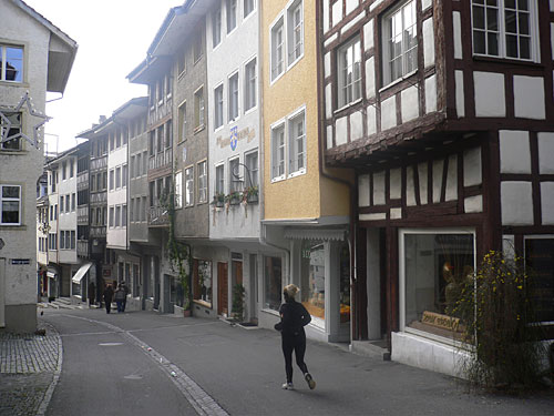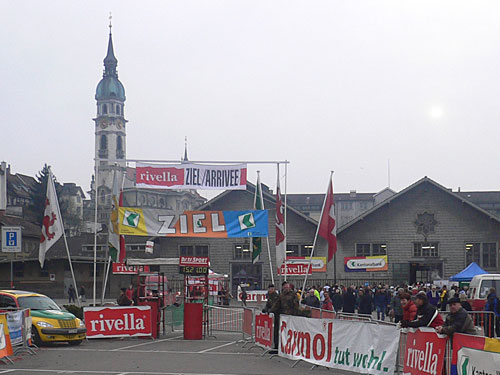 Dann ist es aber geschafft, es geht fast nur noch eben oder abwärts. Wir erreichen den Stadtrand von Frauenfeld und laufen durch ein kleines Waldstück. Trotz des trüben Wetters sind hier viele Spaziergänger unterwegs. Alle haben sie ein „Bravo“ oder „Hopp, hopp, hopp“ für die Läufer übrig. Wir kommen in ein bestimmt sehr teures Wohngebiet mit schönen Villen und großen Gartenanlagen. Auch hier feuern uns immer wieder Gruppen von 5 – 10 Leuten an. Letzter Kilometer. Ein paar Mal noch rechts und links, dann ist das Ziel auf dem Platz hinter der Kaserne erreicht. Ein paar Leute sind noch da und klatschen Beifall.
