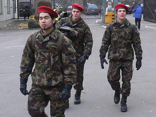 Am Sonntag in aller Früh stehe ich auf dem Hof der Frauenfelder Stadtkaserne. Es ist kalt, Zürich Flughafen meldet Minus 10 Grad. Vereinzelt treffen die ersten Läufer ein. Manche in Zivil, manche schon in Uniform. Alle haben sie einen merkwürdigen Rucksack dabei, in dem entweder das Sturmgewehr (das sind die Soldaten, die noch aktiv an Schießübungen teilnehmen und ihre Waffe zu Hause verwahren) oder ein altertümlicher Karabiner verstaut ist.