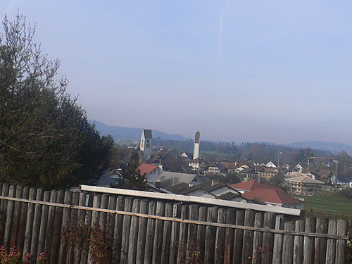 Rechts unten liegt Wängi, deutlich zu erkennen an den zwei Kirchtürmen, der eine schlank der andere breit und wuchtig. Kilometer 9 ist erreicht und es beginnt ein ungefähr 3 Kilometer langer Abschnitt mit 150 Metern Anstieg. Die A 1 wird überquert und nach ungefähr 14 Kilometern wird Eschlikon erreicht und die zweite Verpflegungsstelle. Kurz darauf überhole ich den ersten Waffenläufer. Es ist ein älterer, zäher Kämpfer, der unbeirrt und routiniert die Kilometer abspult.