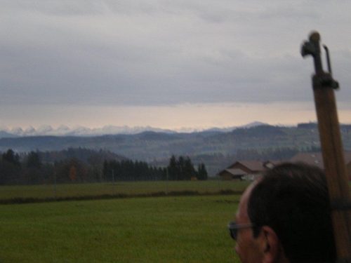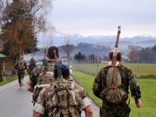 Die Temperatur ist recht milde, denn es ist noch Föhneinfluss, was auch das Panorama deutlich zeigt. Der Säntis und die ebenfalls verschneite Kette der Churfirsten sind am Horizont zu sehen. Der Schnee vor Augen kann aber nicht darüber hinwegtäuschen, dass mir schon ziemlich warm ist. Unter dem Tarnanzug trage ich kurze Laufbekleidung; auf die Radlerhose habe ich nicht verzichtet, um eventuellem Scheuern des doch nicht ganz so feinen Zwirns vorzubeugen.