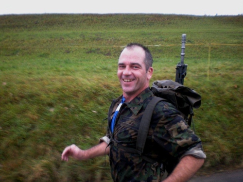 Auf der ersten Streckenhälfte gibt es nur alle sieben Kilometer einen Verpflegungsposten. Im vergangen Jahr als Teilnehmer des zivilen Marathons empfand ich das schon als karg und versuchte mir vorzustellen, wie das jene empfinden, die mit Packung unterwegs sind. Jetzt weiß ich es – und die Vorstellung war realistisch. Zur Entschärfung führe ich in der Beintasche eine kleine Trinkflasche mit und die Reisverschlusstasche am Oberarm ist mit einer Tube Gel gefüllt. Bequemer wäre es, wie viele andere Läufer immer wieder jemanden mit Privatverpflegung am Straßenrand stehen zu haben. Noch weiß ich nicht, ob ich mich heute auf ein einmaliges Abenteuer eingelassene habe. Wenn nicht, dann werde ich das nächste Mal ein paar gute Seelen organisieren, die mich als Betreuer unterstützen.