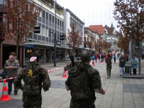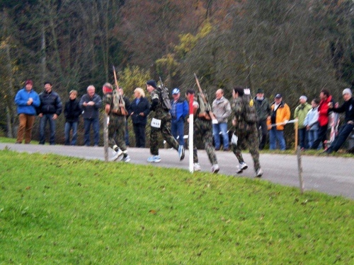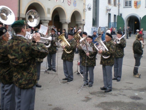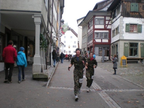 Diese bauliche Kulisse nehme ich nur am Rande wahr. Was für mich an diesem Tag mehr zählt, ist der Empfang der Zuschauer und des Speakers beim Eintritt durch den Torbogen auf den Marktplatz. Ich bin überwältigt über so viel Ehrerbietung. Ich schaffe es aber auch, den Leuten entlang der Absperrungen ein Raunen zu entlocken: Anscheinend bin ich der erste Waffenläufer, der auch mit Kamera bewaffnet ist. Jedenfalls höre ich, wie diese Tatsache mit großem Erstaunen kommentiert wird. Leider ist das Licht zu düster und meine Hand zu wenig ruhig und ich verwackle die meisten Bilder…