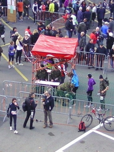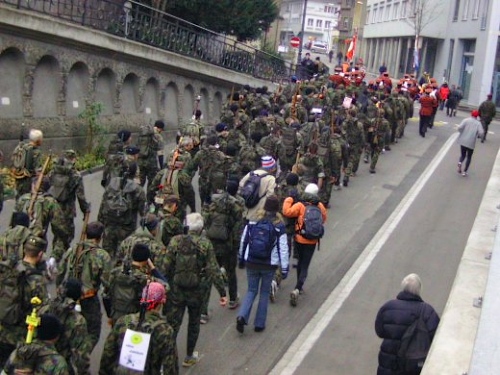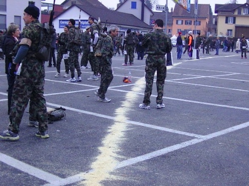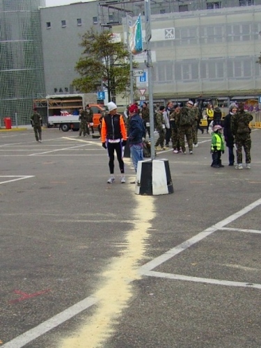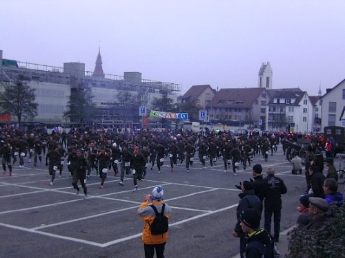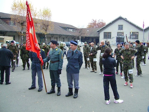 Sonntag 07:00h Da der Marathonstart erst um 10h30 erfolgen wird, Zeit genug fürs Frühstück. Es hat Hochnebel und einige wenige Plusgrade als wir kurz vor halb 10 zur Kaserne gehen, um beim Aufmarsch der Waffenläufer und Waffenläuferinnen dabei zu sein.