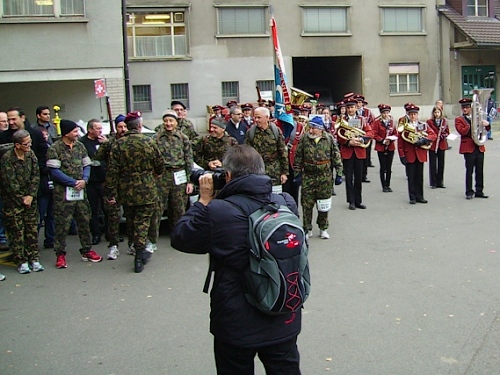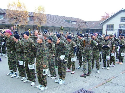 Auch die Blasmusik fehlt nicht. An der Kasernenmauer lehnen Packungen mit Gewehr, das Gepäck der Waffenläufer. Passen gut zu den Tarnanzügen der Teilnehmer. Nachdem eine gewisse Ordnung in der Aufstellung eingetreten ist, werden die Jubiläumsteilnehmer aufgerufen und zum Gratulieren nach vorne gebeten. Anna beispielsweise nimmt ihren 100sten Waffenlauf in Angriff (nicht alles sind Marathons). Es wird auch ein Teilnehmer geehrt, der zum 40. Mal den Frauenfelder Waffenlauf in Angriff nehmen wird. Also 40 x die Marathondistanz. Das setzt zur Ausdauerleistung über die Jahrzehnte auch ein gewisses Mindestalter voraus.
