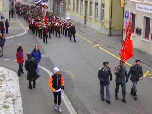 Abmarsch zum Start. Voran die Blasmusik, hinterher in loser Formation die Waffenläufer, teilweise mit geschmückten Gewehrläufen: Blumen, Fahnen, Maskottchen . . .