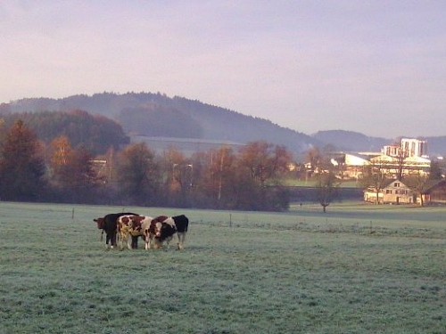 10:56h Schon 5km, und das bei diesen Höhenmetern! Das ging ja gut soweit. Runter in den Ort und auf der gegenüber liegenden Seite wieder rauf. Gut, dass ich nur mehr 95kg habe, das macht es leichter. Bei km7 gibt es die erste Labestelle: warmes Wasser, Tee und Suppe. Es ist hier oben aber unangenehm windig, sodass ich mich nicht allzu lange aufhalte. Nun geht es leicht bergab nach Sunehof, hier haben sich einige Zuseher versammelt. „Hopp!“ höre ich immer wieder. An einem Altersheim vorbei, durch eine Siedlung und erstmals Kiesbelag, kein Asphalt. Aber nicht für lange. Es geht steil runter, an Gänsen vorbei auf die Wiler Strasse, die hier von der Eisenbahn begleitet wird. Für uns LäuferInnen ist der Gehweg reserviert.