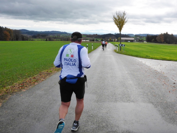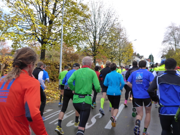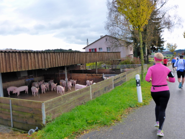 Das Feld sortiert sich schnell. Norbert und ich reihen uns hinten ein. Es geht auch schon gleich kräftig bergauf. Zuschauer stehen rechts und links der Straße und applaudieren. Wir gehen in zügigem Tempo. Dadurch können wir am Ortsausgang locker anlaufen, denn es wird flacher. Kurz vor dem Wald verabschiedet sich Norbert und läuft davon. Es geht jetzt kurz bergab. Dann aber gleich wieder steil bergauf. Der Wald endet und eine beschauliche Ebene breitet sich vor uns aus. Der offene Schweinestall direkt am Weg erfreut trotz schweinischem Geruch die vorbeikommenden Läufer. Kommt es mir nur so vor oder posieren die süßen Ferkel extra für die Kamera?