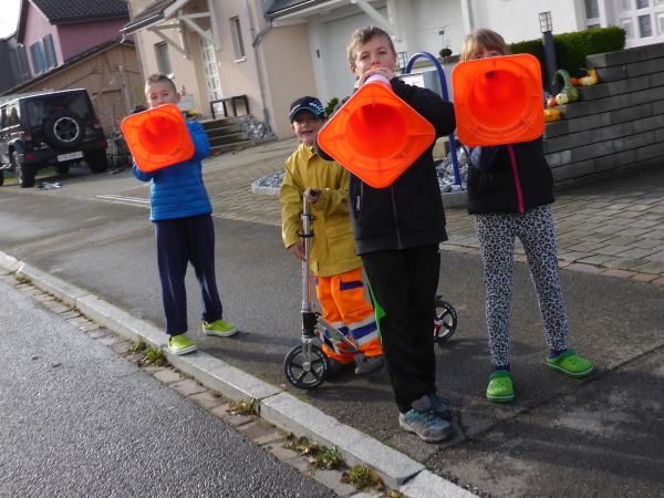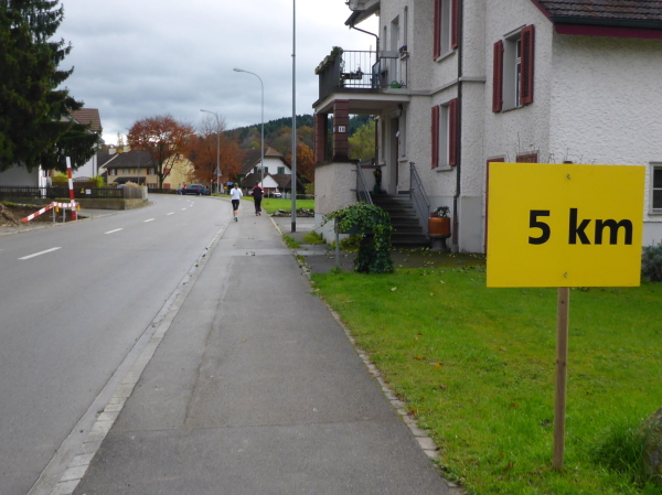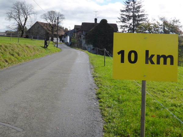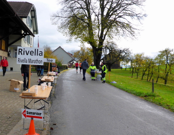 Schon erreichen wir Matzingen, km 5. Es geht bergab, mitten durch den Ort und hinten wieder bergauf. An der Steigung steht eine Familie mit einem Schild: „ Press here for Power“. Zur Sicherheit drücke ich - man kann ja nie wissen. Am Weiler Ruggenbühl liegt die erste Verpflegungsstation. Bouillon, das isotone Rivella-Marathon, Wasser und Tee werden angeboten.