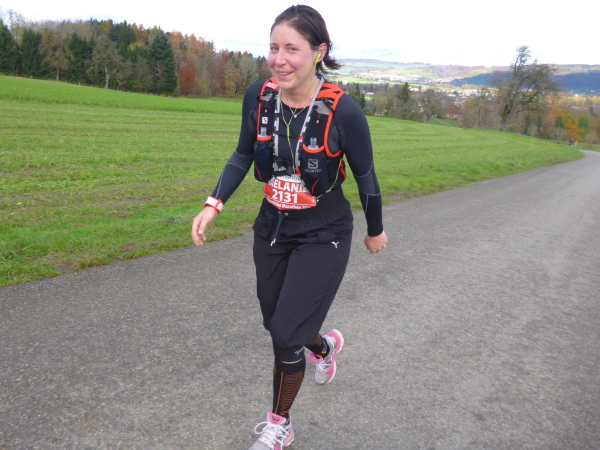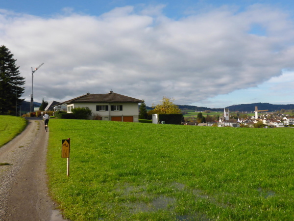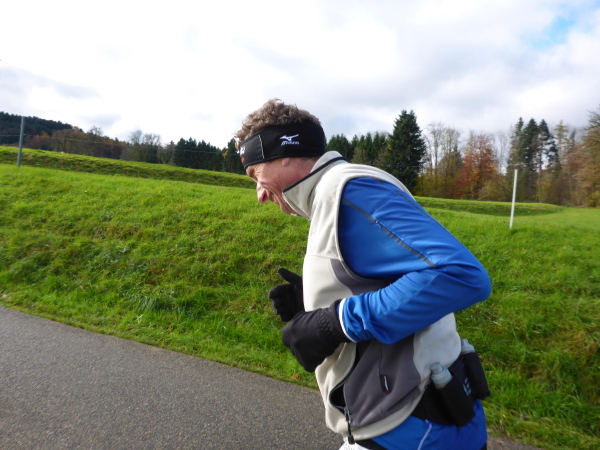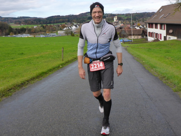 Nun laufen wir nochmals kurz bergauf (km10). Jetzt lässt sich zum ersten Mal die Sonne blicken. Die Wetterprognosen für den Sonntag waren lange uneinheitlich. Die starken Regenfälle der letzten Tage haben pünktlich aufgehört; mit Sonne habe ich aber nicht gerechnet. In sattem Grün erstrahlen große Weideflächen vor uns. Die A1 ist hier „tiefergelegt“, und so können wir sie, ohne Höhenmeter zu machen, überqueren. Dafür erhebt sich dahinter eine größer Berg. Na ja, Berg ist vielleicht übertrieben. Trotzdem ist hier Gehen angesagt. Ich überhole das Besenfahrrad mit Peter, dem letzten Waffenläufer. Er hat noch einen langen Weg vor sich. Kurz vor dem Gipfel haben die Samariter eine Liege für Erste Hilfe aufgestellt. Verlockend, ein Bett auf der Strecke. Da würde ich aber nie wieder hoch kommen, also lasse ich das mal lieber. Von oben haben wir jetzt einen tollen Blick auf Eschlikon. Hier steht die zweite VP mit zusätzlich Bananen.