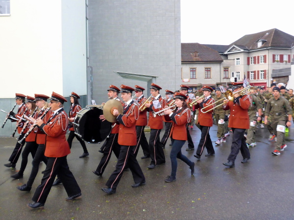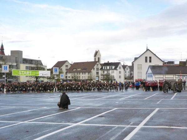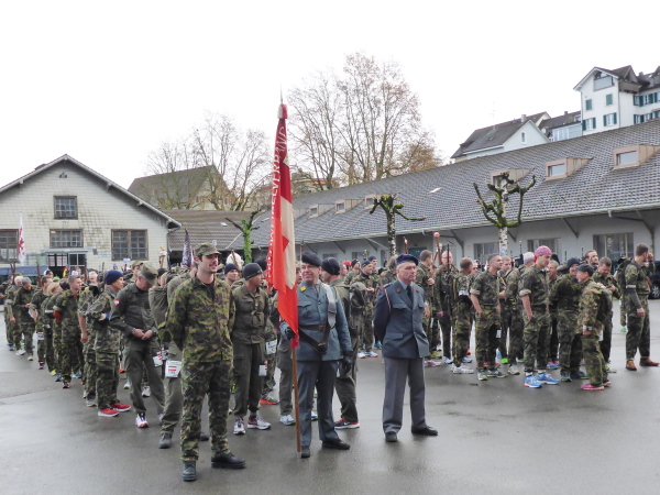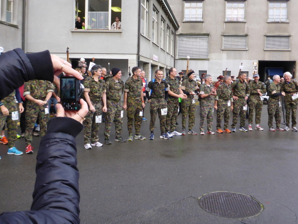 Die Zuschauer werden aufgefordert, den Weg frei zu machen, denn es wird abmarschiert. Zuerst kommen die Fahnenträger gefolgt von der Kapelle, dann in Zweier Marschformation die Hauptakteure. Es geht durch die Stadt zum mehrere hundert Meter entfernten Marktplatz. Man stelle sich einen großen Platz vor. In der Mitte befindet sich ein Startbanner und eine mit Sägemehl markierter Startlinie über den ganzen Platz. Die kurze Zeit bis zum Start wird mit Fachsimpeln, Frotzeln und Fotografieren verbracht. Ohne den Einheitsdress und das Gepäck (bei Männer sogar mit Waffe) würde man keinen Unterschied zu einer normalen Sportveranstaltung vermuten. Nur die Artilleriekanone passt nicht so recht ins Läuferbild.