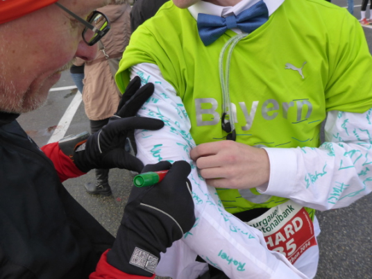 Nun aber haben Norbert und ich es eilig. In einer halben Stunde ist bereits der Marathonstart und wir wollen noch einmal zurück zur Kaserne. Dummerweise nehmen wir die falsche Straße und machen einen ungewollten Umweg. Nun sind wir wenigstens schon warm. Als wir den Marktplatz wieder erreichen, hat sich das Bild gewandelt. Über zweihundert bunt Gekleidete haben die Herrschaft übernommen. Erneut wird gefachsimpelt, gefrotzelt und Fotos gemacht. Gerhard sammelt Unterschriften aller Läufer. Er hat in den letzten 10 Jahren jedes Jahr über 10 Marathons gefinsht. Wenn das kein Grund zum Feiern ist.