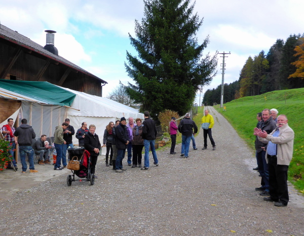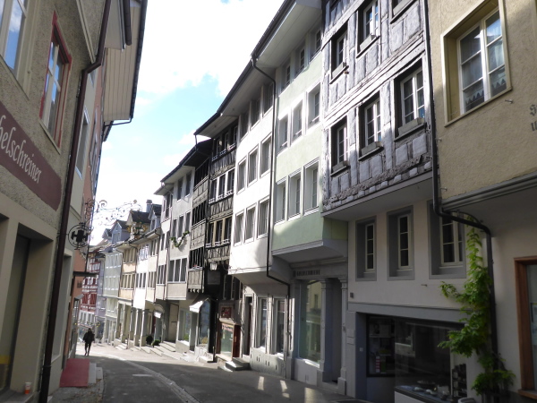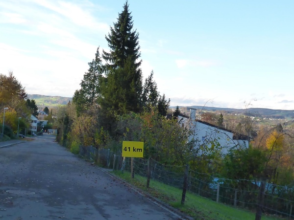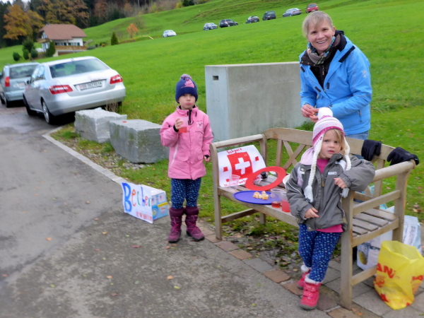 Auf geschottertem Weg laufen wir wellig oberhalb des Bahndamms abwechselnd im Wald und dann wieder mit schöner Aussicht. Im Wohngebiet sind viele Schlachtenbummler auf der Straße. Kinder bieten Mandarinenschnitze und Getränke an. Sogar an Abfallbehälter für gebrauchte Becher ist gedacht. Hinter einem Haus ist ein großes Partyzelt aufgebaut. Davor herrscht lockere Stimmung. Eine Frau bietet mir Appenzeller an, eine Spezialität der Region. Ein Stück Käse wäre jetzt ganz gut. Sie flitzt nach hinten und bringt mir - naja mit Käse hat das nichts zu tun - ein kleines Gläschen mit Likör. Ui - ist der scharf. Aber da muss ich durch. Im letzten Jahr habe ich Ewald, einen einheimischen Läufer kennengelernt. Er wurde damals beinahe in jedem Ort zu solch einer kleinen Pause „gezwungen“ und es hat ihm auch nicht geschadet.