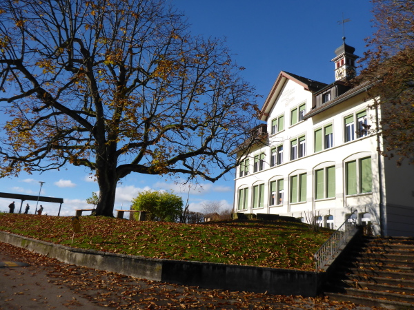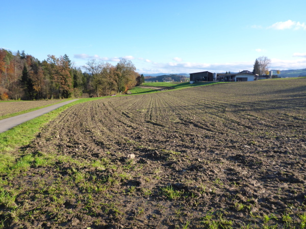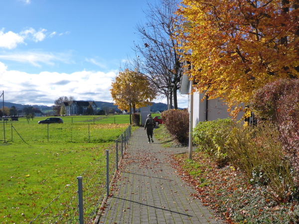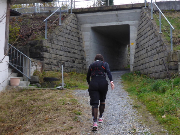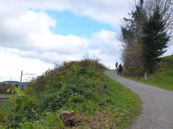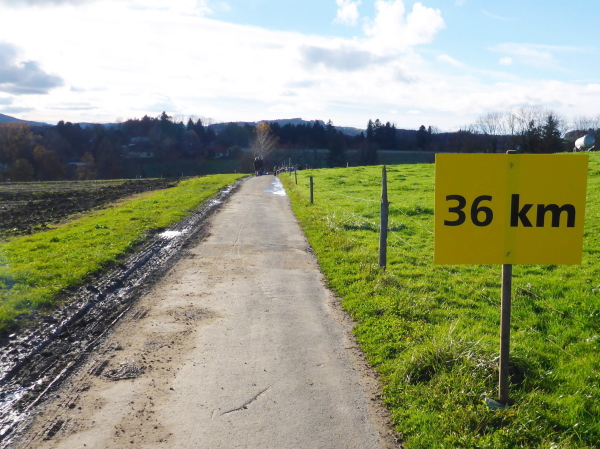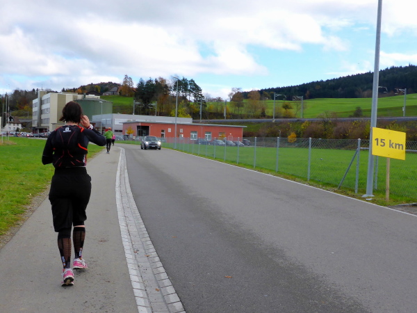 Hier war vor gut 20 Minuten der Start des Halbmarathons und die Helfer sind gerade dabei, das Chaos zu beseitigen. Ich genieße die tolle Kulisse und einen Becher Bouillon, dann geht es den Marktplatz entlang und bergab bis zur Fußgängerzone. Auf der Begegnungsstrecke einen kurzen Blick auf die hinter mir Laufenden, dann werde ich scharf rechts geleitet. Hier lockt mich laute Musik und der himmlische Geruch gebrannter Mandeln. Ein kleiner Vergnügungspark unterhält vor allem jüngere Besucher. Es folgt ein längeres Stück im Wohngebiet. In Bronschofen kommen wir am alten Schulhaus vorbei. Wir überqueren die Bahn und müssen dann rechts über eine Wiese. Der Regen hat ganze Arbeit geleistet; es wird immer matschiger. Am Ende der Wiese halten wir uns links auf den Feldweg zu. Ein langes flaches Stück folgt (km 25).