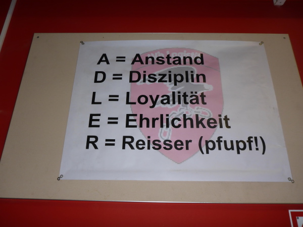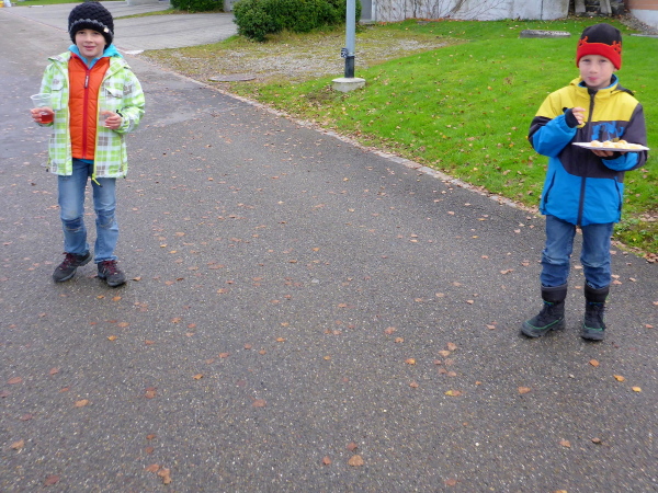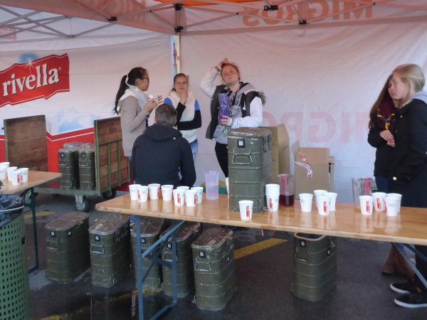 Norbert erwartet mich bereits. Es wird heißer Pfefferminztee angeboten. In der großen Halle gibt es Rivella. Jeder Finisher kann zwischen einer Medaillennadel, 10 Franken oder einem Glas Honig auswählen. In der Halle gibt für kleines Geld ein Läuferessen (Suppe, glacierter Schweinsbraten, Kartoffelstock, Erbsli und Rüebli), während gleichzeitig draußen die Siegerehrungen laufen.