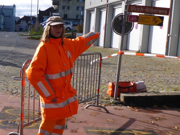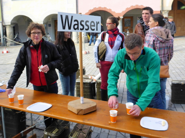 Wil ist in Sicht. Eine private Verpflegungsstelle bietet Getränke an, die die vier Waffenläufer vor mir gerne annehmen. Im Vorbeilaufen erkenne ich auch eine Frau unter den Waffenläufern. Es geht weiter an der Straße entlang. Wie überall an der Strecke werden unübersichtliche oder gefährliche Stellen von Helfern, meist Militärangehörige, gesichert. Sie sorgen dafür, dass die Läufer ungefährdet und ohne anhalten zu müssen, vorwärts kommen. Besonders hier in der Stadt sind sie gefordert. Wir erreichen den Bahnhof und müssen durch eine Unterführung. Auf der anderen Seite liegt die breite Fußgängerzone. Es ist nicht viel los. Auf einem kurzen Begegnungsstück kommen gerade zwei Waffenläufer und dann noch eine Waffenläuferin. Dann geht es rechts durch die kleine Kirchgasse. Scharf links liegt das Schnetztor, durch das wir den historischen Marktplatz betreten. Wie bereits im letzten Jahr bewundere ich das tolle Ambiente.
